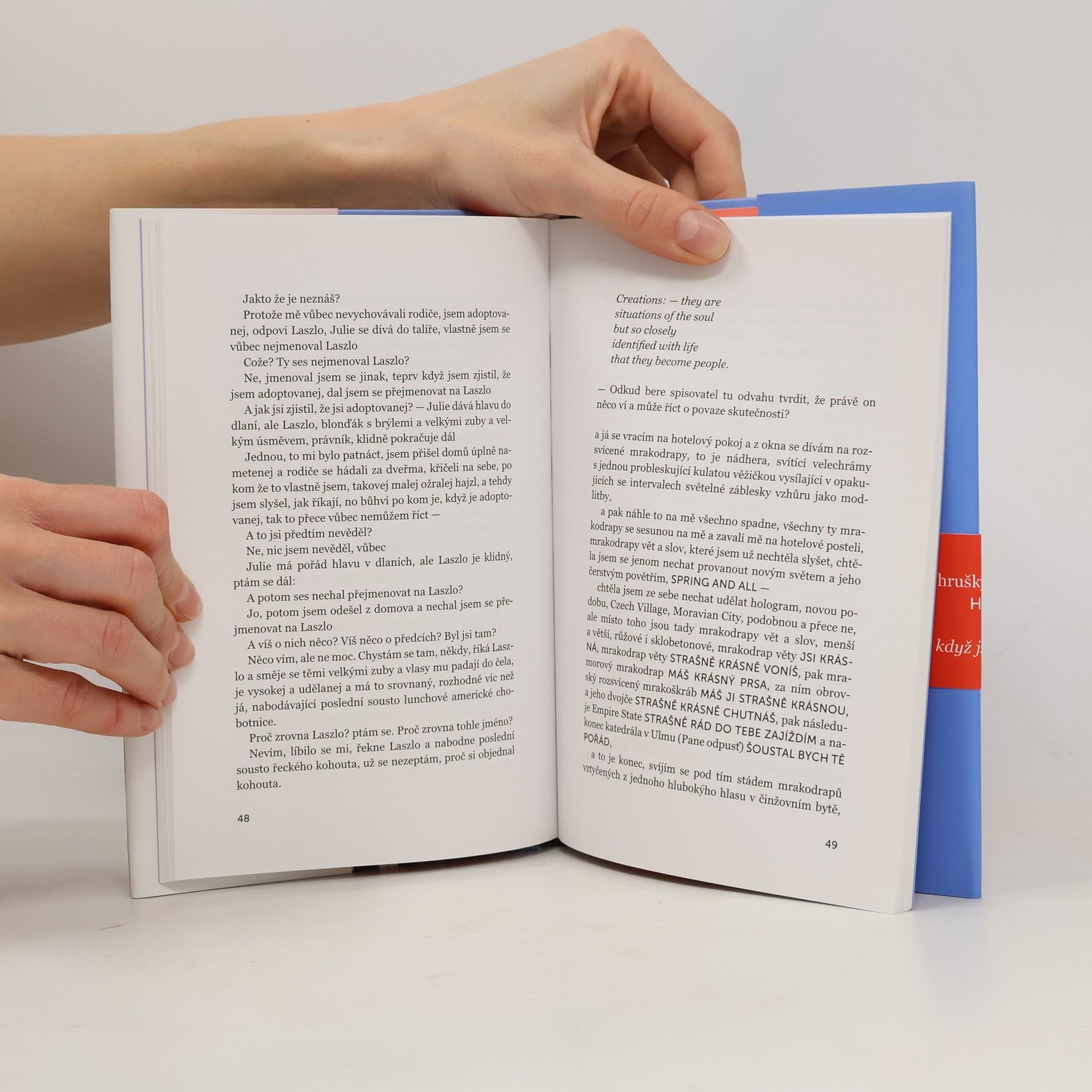 Text představuje formálně zcela specifický útvar, kombinaci prozaického a veršového tvaru, promíšený také anglickými prvky. Byl podnícen autorčinou cestou do USA v roce 2010, kdy tam absolvovala poetry reading tour po východní a střední části země. Tato situace zde však slouží pouze jako odrazový můstek pro rozehrání mnoha dramatických situací i reflexí, vztahujících se ke kulturně odlišné - ale v lecčems podobné - povaze obou kontinentů i jejich obyvatel, stejně jako k otázce, jaká je povaha spisovatelovy práce. Formálně tu najdeme verše v češtině i angličtině, záznamy (nebo fabulace?) dialogů, úryvky z kronik prvních příchozích a osadníků, popis České vesničky/Czech Village v Cedar Rapids i návštěvy MOMA, Museum of Modern Art v New Yorku. Přitom se ale nejedná o cestopis ani reportáž, sledujeme příběh, do něhož náhle vstoupí smrt a který zároveň vypovídá o konci milostného vztahu. Půvab textu je nesen kombinací určitého naivismu na straně jedné a vzdělaného a kultivovaného záběru na straně druhé - spojení myšlenkové reflexe a konfese, věcnosti a intimity, bezprostřednosti a odstupu.