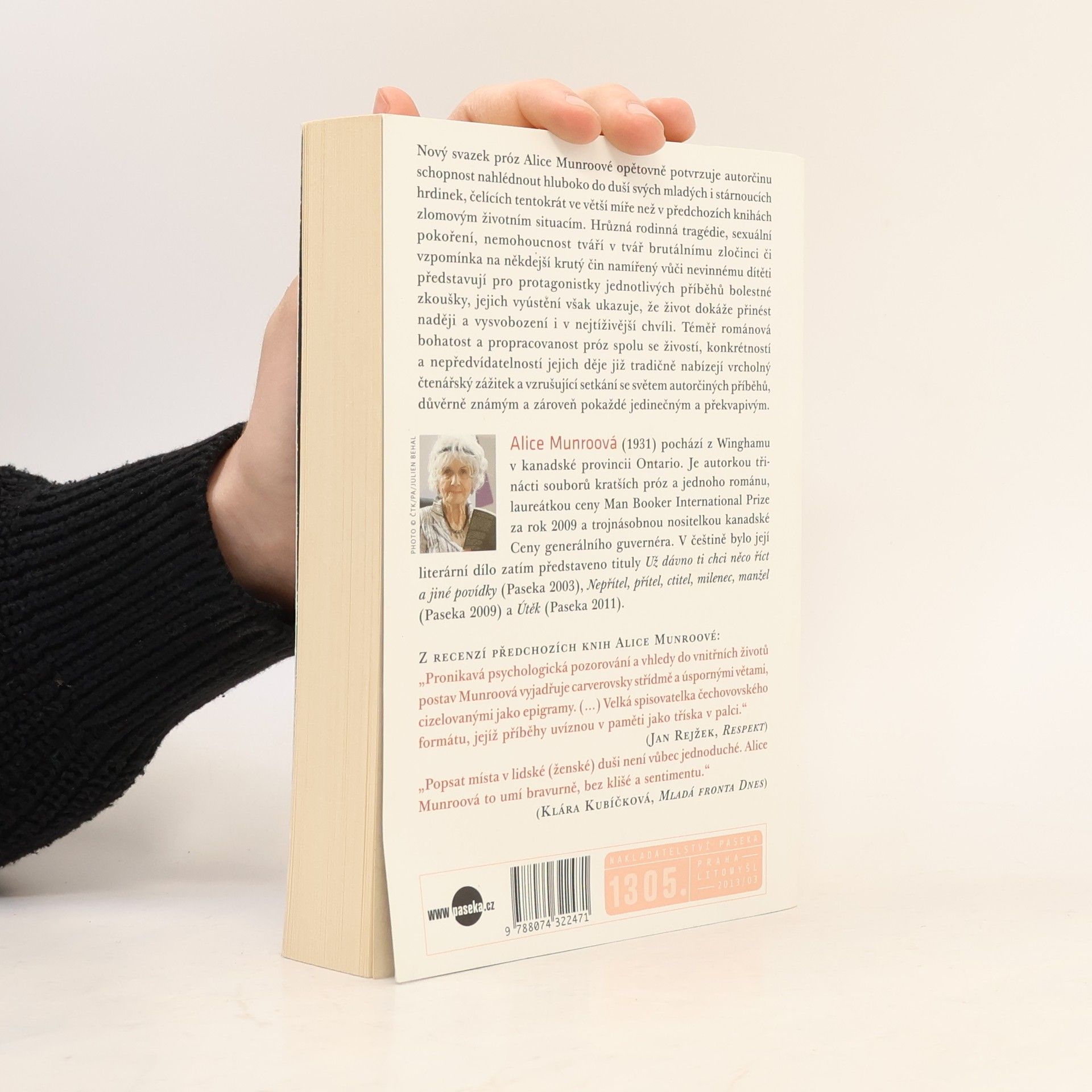 Zatím poslední svazek próz Alice Munroové opětovně potvrzuje autorčinu schopnost nahlédnout hluboko do duší svých mladých i stárnoucích hrdinek, čelících tentokrát ve větší míře než v předchozích knihách zlomovým životním situacím. Hrůzná rodinná tragédie, sexuální pokoření, nemohoucnost tváří v tvář brutálnímu zločinci či vzpomínka na někdejší krutý čin namířený vůči nevinnému dítěti představují pro protagonistky jednotlivých příběhů bolestné zkoušky, jejich vyústění však ukazuje, že život dokáže přinést naději a vysvobození i v nejtíživější chvíli. Téměř románová bohatost a propracovanost próz spolu se živostí, konkrétností a nepředvídatelností jejich děje nabízejí již tradičně vrcholný čtenářský zážitek a nové vzrušující setkání se světem autorčiných příběhů, důvěrně známým a zároveň pokaždé jedinečným a překvapivým.