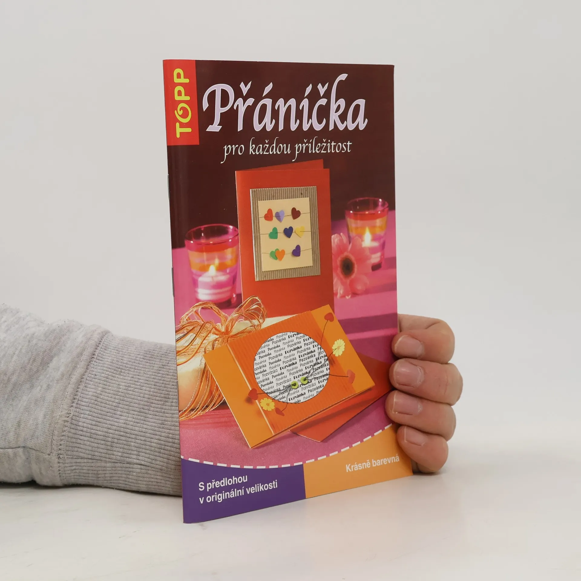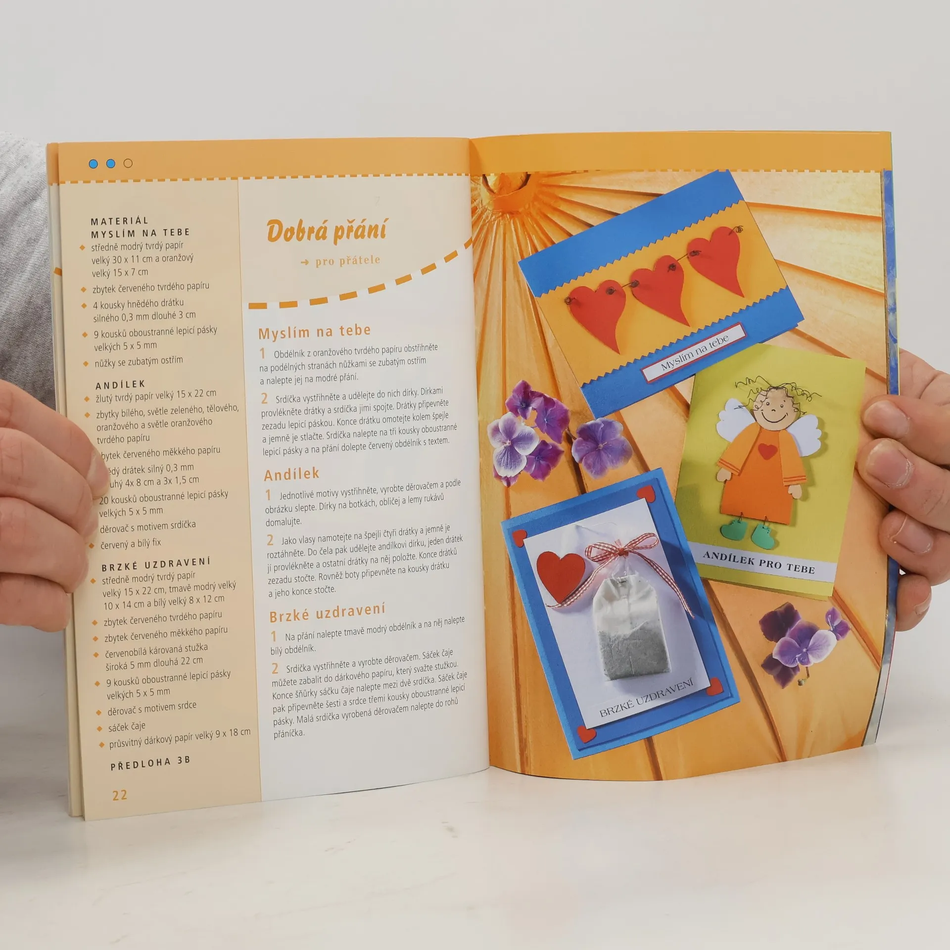 Přáníčka zhotovená z papíru, s použitím jednoduchých grafických tvarů s originálními motivy květin, srdíček, použitelná také jako zástrčky do knih nebo závěsné motivy do oken. Vloženy 23 předlohy v originální velikosti