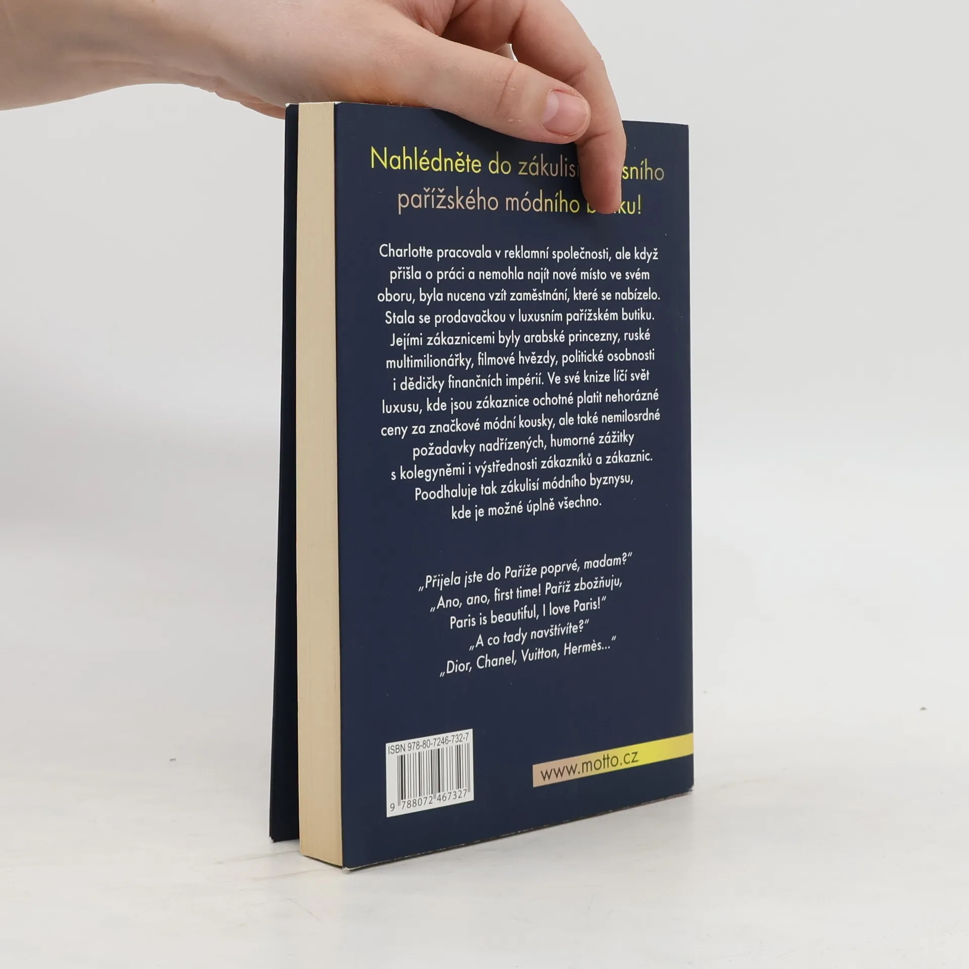 Charlotte pracovala v reklamní společnosti, ale když přišla o práci a nemohla najít nové místo ve svém oboru, byla nucena vzít zaměstnání, které se nabízelo. Stala se prodavačkou v luxusním pařížském butiku. Jejími zákaznicemi byly arabské princezny, ruské multimilionářky, filmové hvězdy, politické osobnosti i dědičky finančních impérií. Ve své knize líčí svět luxusu a poodhaluje zákulisí módního byznysu, kde je možné úplně všechno.