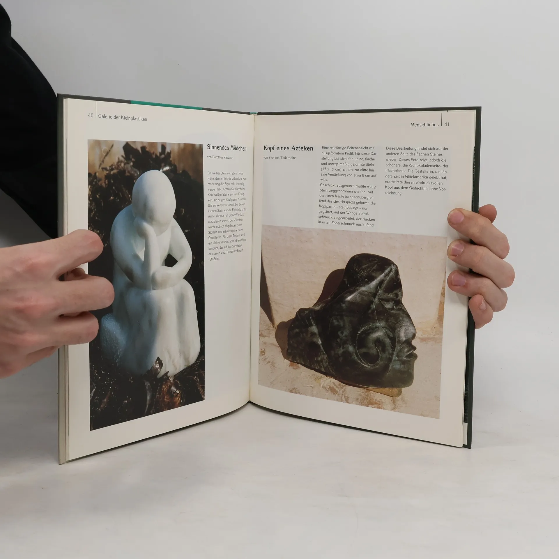 Beschreibt Material, Handwerkszeug, Arbeitsplatz und Quellen zur Ideenfindung, schildert anhand einer Bildfolge den Werdegang einer Plastik vom Rohling bis zur Endpolitur.
