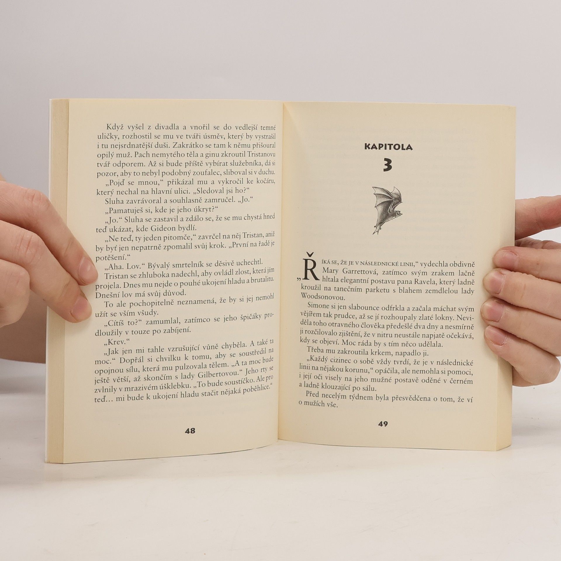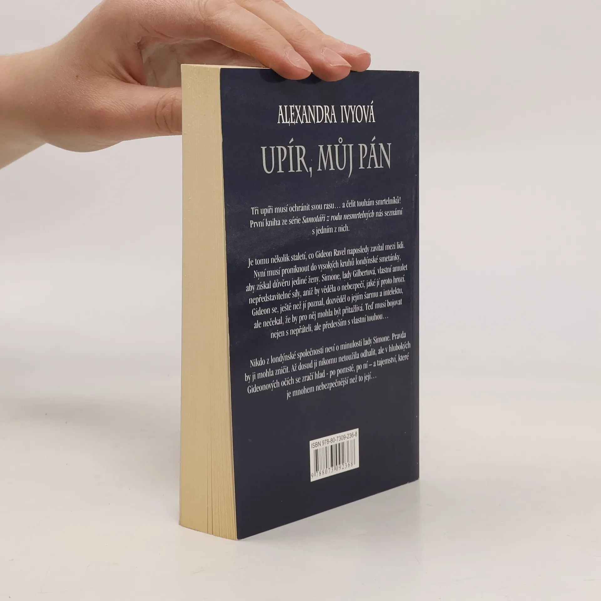 Tři upíři musí ochránit svou rasu... a čelit touhám smrtelníků! První kniha ze série Samotáři z rodu nesmrtelných nás seznámí s jedním z nich. Je tomu několik staletí, co Gideon Ravel naposledy zavítal mezi lidi. Nyní musí proniknout do vysokých kruhů londýnské smetánky, aby získal důvěru jediné ženy. Simone, lady Gilbertová, vlastní amulet nepředstavitelné síly, aniž by věděla o nebezpečí, jaké jí proto hrozí. Gideon se, ještě než jí poznal, dozvěděl o jejím šarmu a intelektu, ale nečekla, že by pro něj mohla být přitažlivá. Teď musí bohovat nejen s nepřáteli, ale především s vlastní touhou... Nikdo z londýnské společnosti neví o minulosti lady Simone. Pravda by ji mohla zničit. Až dosud ji nikomu netoužila odhalit, ale v hlubokých Gideonových očích se zračí hlad - po pomstě, po ní - a tajemství, které je mnohem nebezpečnější než to její...