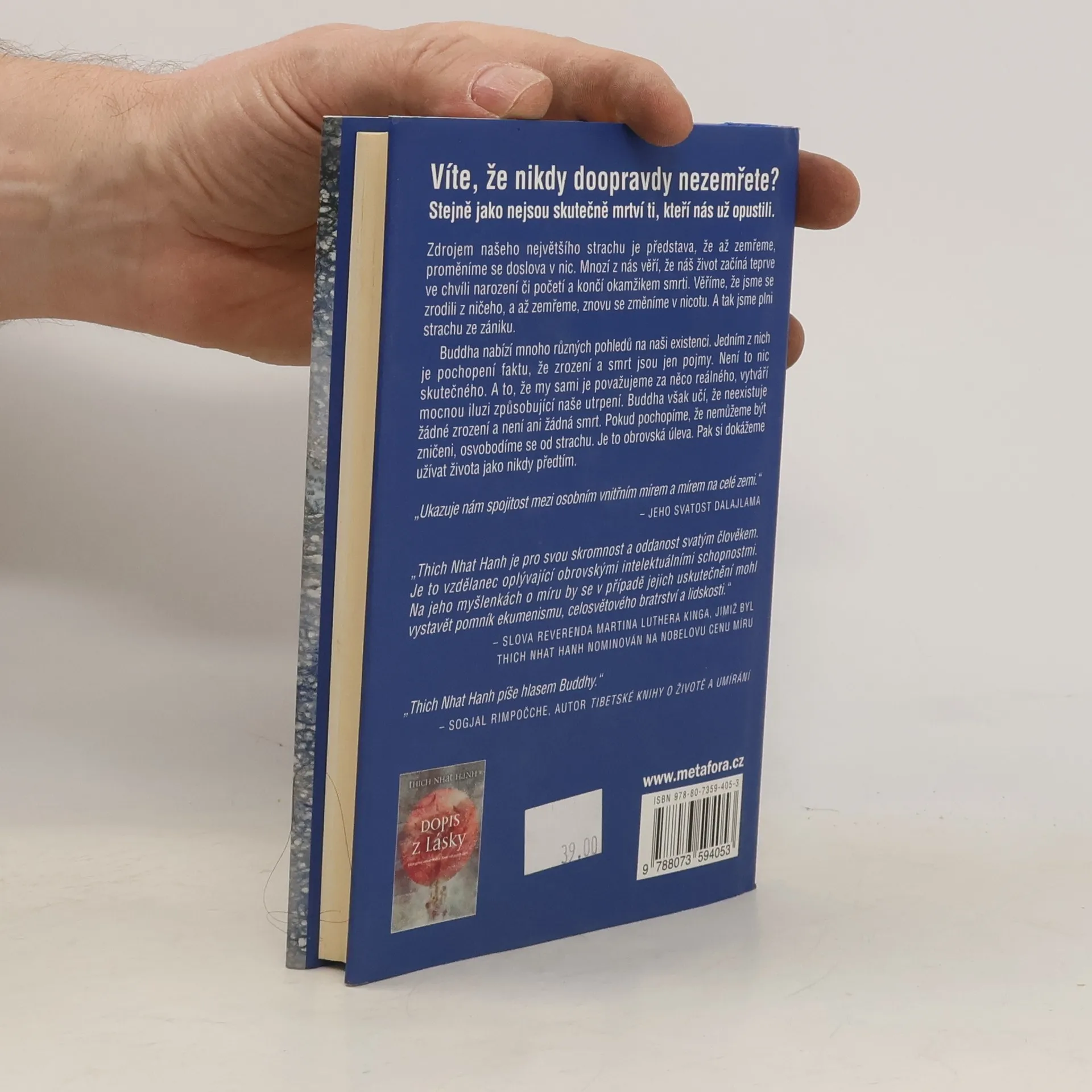 Nejvyšší moudrost pro štěstí a útěchu. Skutečné tajemství života. Dokážeme si vskutku cenit života, nebo na něm jen lpíme vedeni strachem z neznámého, z toho, že v okamžiku smrti prostě přestaneme existovat? Vietnamský buddhistický mnich Thich Nhat Hanh nás za pomoci filozofie, výstižných analogií a návodů k meditacím provede cestou k podstatě smrti, strachu i samotné existence. S radostnou lehkostí a naprostou srozumitelností i pro „západního člověka“ nám dává nahlédnout do starých pravd, v nichž buddhističtí mniši a mnišky žijí už dva a půl tisíce let. Budeme-li mu naslouchat, pochopíme, že smrt není žádný strašlivý a definitivní konec. A že ani my, ani naši drazí ve skutečnosti nikam neodcházíme.