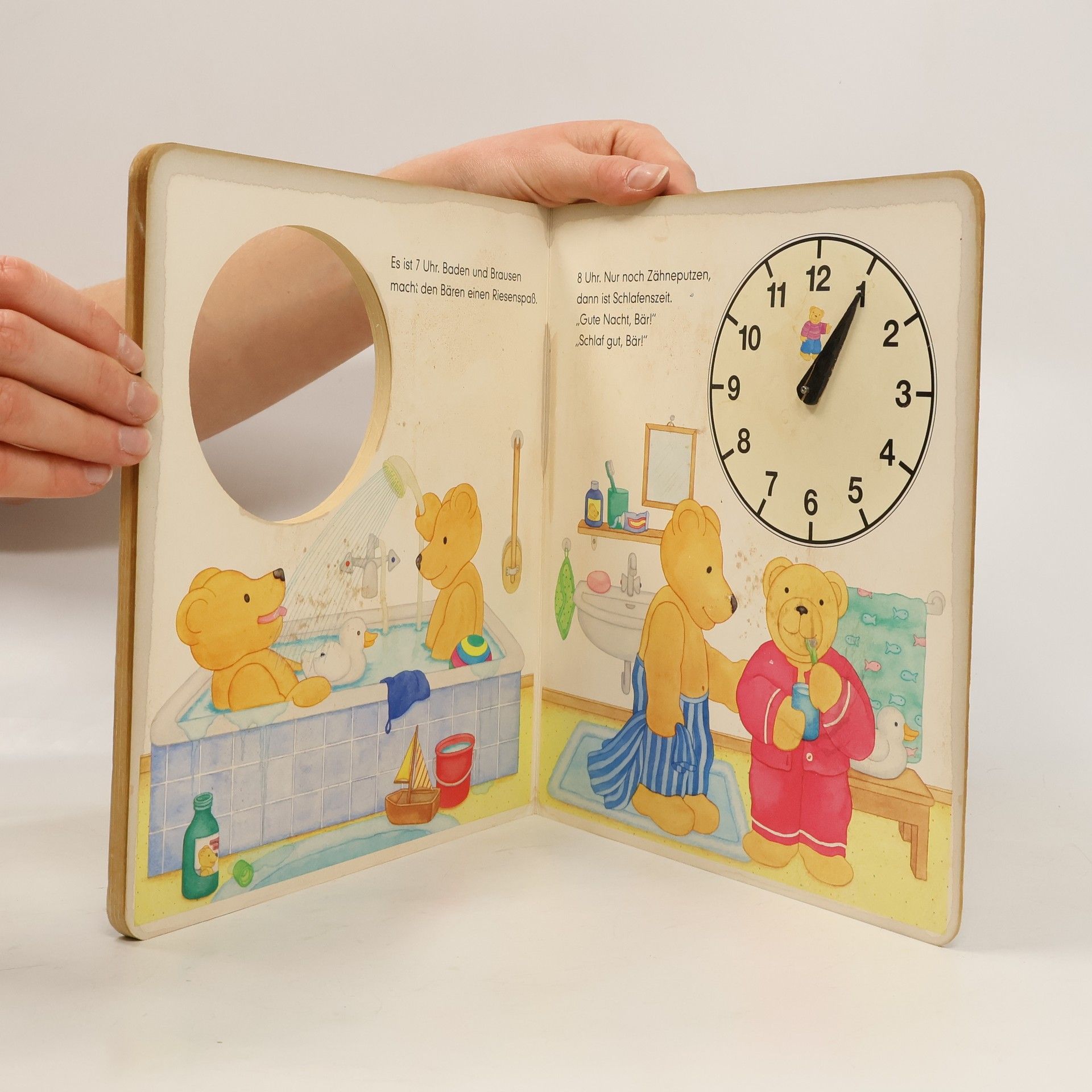 Ein Uhren- und Bärenbilderbuch. Kinder können anhand der ausgestanzten Uhr mit den beweglichen Zeigern lernen, die Zeit abzulesen, und sie können sich die Geschichte vom Tageslauf zweier kleiner Bären vorlesen lassen.