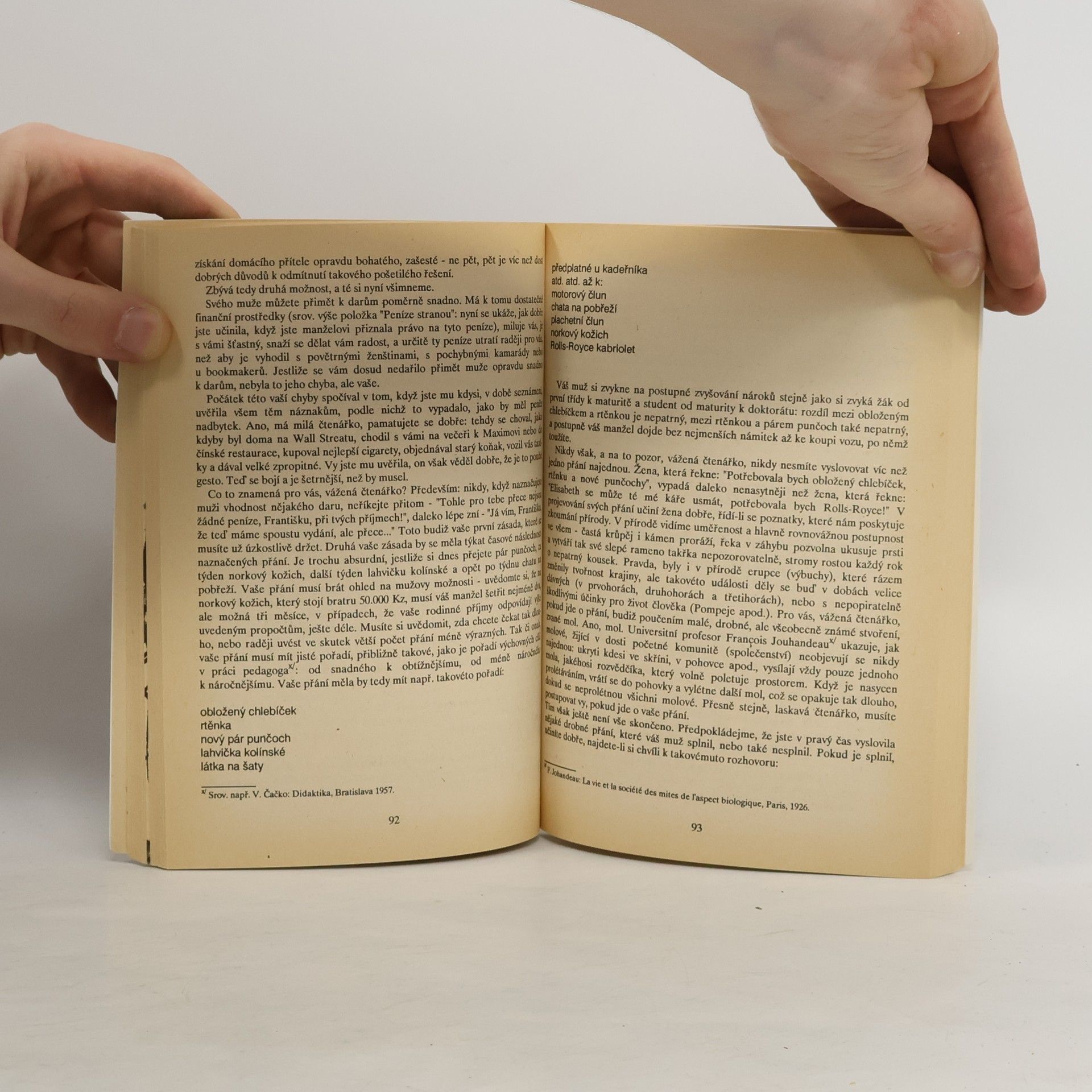 Humorný návod pro ženy na vytvoření šťastného partnerského vztahu. Autorem knihy je muž, který se rozhodl poskytnout všem ženám a slečnám několik praktických rad na vytvoření šťastného vztahu s muži. Jeho hlavní zásadou je : žena musí učinit vše, aby byl muž spokojen a šťasten, jen tak pak v ní nalezne zalíbení, které může být korunováno sňatkem. A tak ženy by měly začít moderně vařit, starat se o sebe i o byt, hýčkat své vyvolené, neponižovat je převratnými úspěchy ve vlastní kariéře, ale ani v nich nevzbuzovat pocit, že "ta jejich nic nedokázala". Kniha emancipované ženy asi příliš nepotěší, je ovšem otázkou, nakolik své rady autor myslel vážně a nakolik se jedná jen o postřehy z oblasti mezilidských vztahů, podané s notnou dávkou ironie.