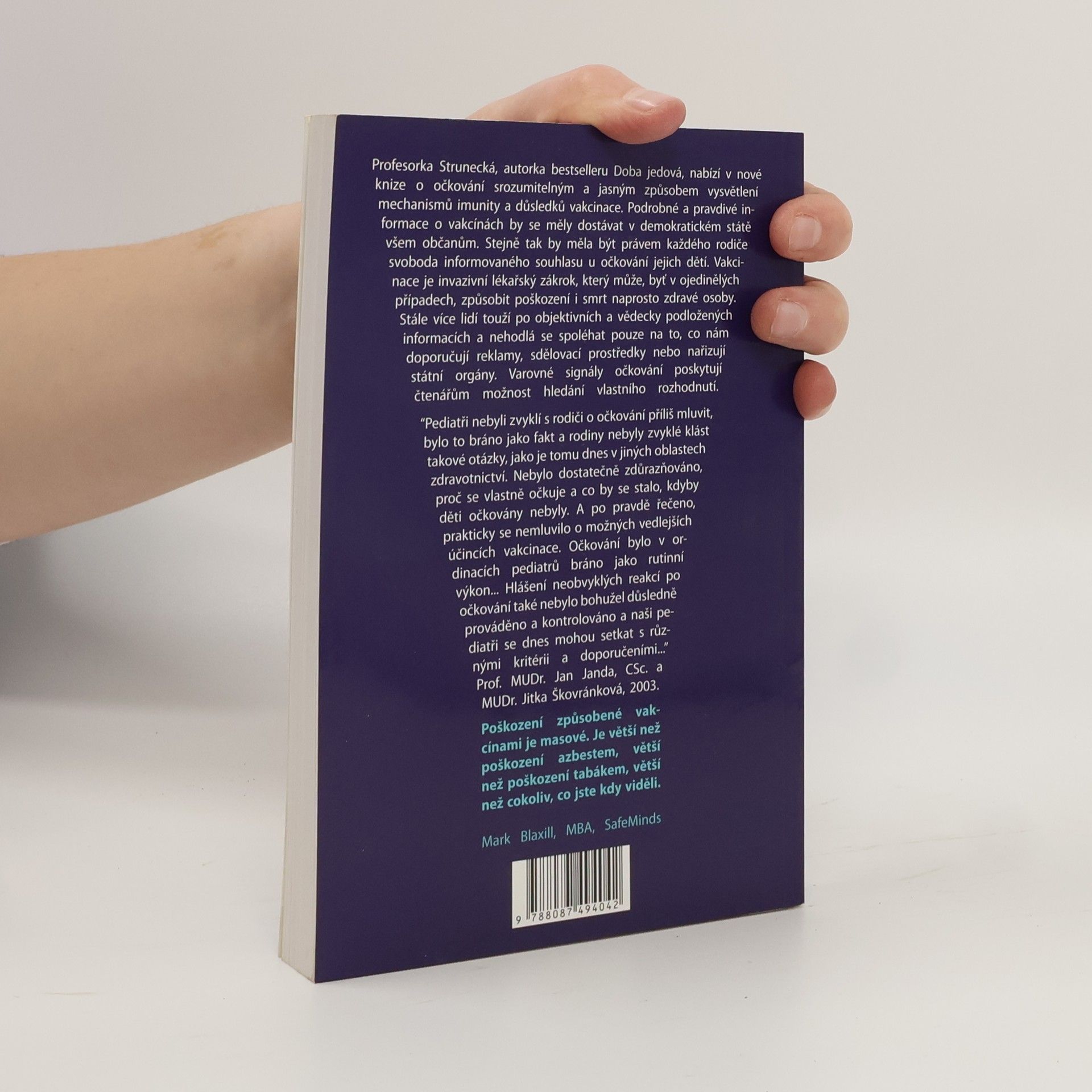 Profesorka Strunecká, autorka bestselleru Doba jedová, nabízí v nové knize o očkování srozumitelným a jasným způsobem vysvětlení mechanismů imunity a důsledků vakcinace. Podrobné a pravdivé informace o vakcínách by měly být přístupné v demokratickém státu všem občanům. Stejně tak by měla být právem každého rodiče svoboda informovaného souhlasu u očkování jejich dětí. Vakcinace je invazivní lékařský zákrok, který může, byť v ojedinělých případech, způsobit poškození i smrt docela zdravé osoby. Stále více lidí touží po objektivních a vědecky podložených informacích a nehodlá se spoléhat pouze na to, co nám doporučují reklamy, sdělovací prostředky nebo nařizují státní orgány. Podobná kniha na českém knižním trhu dosud chybí. Čtenáři zde najdou i rady rodičům k očkování od praktické lékařky a legislativní část zpracovanou právníkem podle posledních úprav zákona o veřejném zdraví.