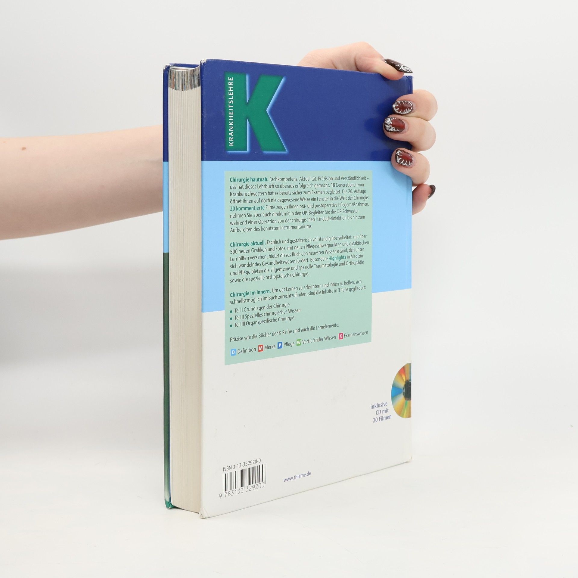 Fachkompetenz, Aktualität, Präzision und Verständlichkeit. 18 Generationen von Krankenschwestern hat es bereits sicher zum Examen begleitet. 20 kommentierte Filme zeigen Ihnen prä- und postoperative Pflegemaßnahmen, nehmen Sie aber auch direkt mit in den OP. Begleiten Sie die OP-Schwester während einer Operation von der chirurgischen Händedesinfektion bis hin zum Aufbereiten des benutzten Instrumentariums. Chirurgie aktuell. Mit über 500 Grafiken und Fotos, mit Pflegeschwerpunkten und didaktischen Lernhilfen versehen, bietet dieses Buch den neuesten Wissensstand, den unser sich wandelndes Gesundheitswesen fordert. Besondere Highlights in Medizin und Pflege bieten die allgemeine und spezielle Traumatologie und Orthopädiesowie die spezielle orthopädische Chirurgie. Chirurgie im Innern. Um das Lernen zu erleichtern und Ihnen zu helfen, sich schnellstmöglich im Buch zurechtzufinden, sind die Inhalte in 3 Teile gegliedert: Teil I Grundlagen der Chirurgie Teil II Spezielles chirurgisches Wissen Teil III Organspezifische Chirurgie
