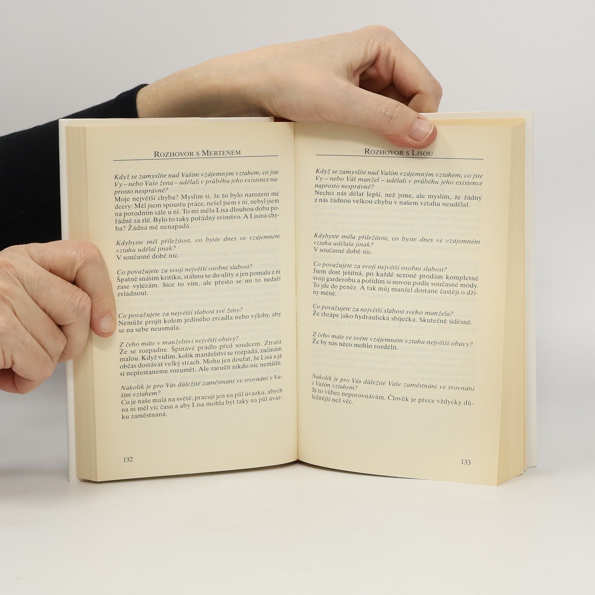 Kniha pojednává o manželství a partnerských vztazích, ale i o lásce neobvyklým způsobem: oba manželé vyprávějí bez zábran a nezávisle na sobě příběh svého vztahu. Autorka nahlíží do nejtajnějších zákoutí duší mužů i žen a do hloubky prozkoumává jejich intimní soužití. Tam, kde se jeden z manželů snaží něco zastřít nebo utajit, čtenář rychle vystihne porovnáním jejich odpovědí situaci a vycítí i nevyslovené.