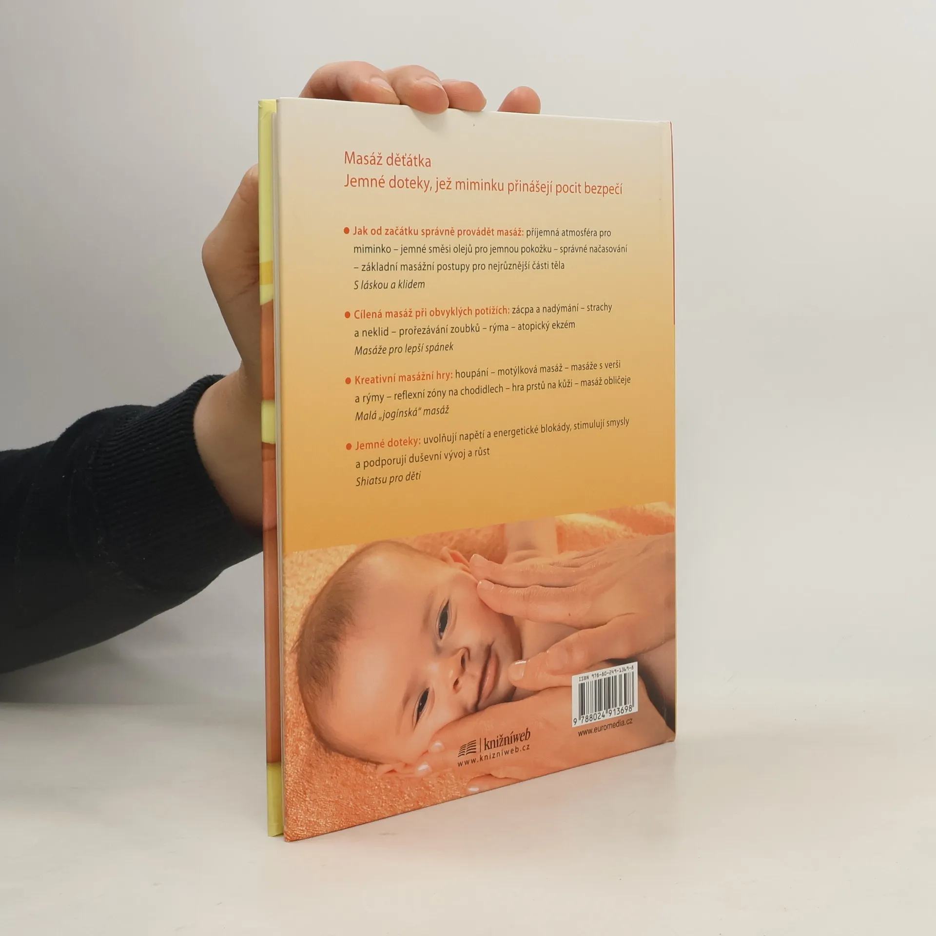 Jemné doteky přinášejí miminku pocit lásky a bezpečí. Rodiče se naučí krok za krokem provádět masáž kojenců a batolat v příjemné atmosféře domova. Zvládnou masážní postupy pro nejrůznější části těla. Zvolí cílenou masáž při potížích, jako je zácpa, nadýmání, neklid, prořezávání zoubků, rýma či atopický ekzém. Kreativní masážní hry pomáhají navázat láskyplný vztah. A jako bonus – shiatsu: jemné doteky, které uvolňují napětí a podporují duševní vývoj a růst miminka