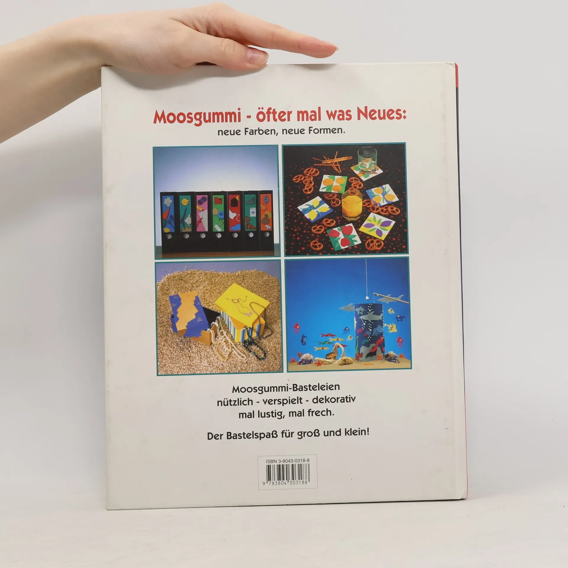 Moosgummi hat offenbar weiterhin Konjunktur, hier ein weiterer Band, der die vielseitigen Verwendungsmöglichkeiten dieses Bastelmaterials zeigt. Boten die meisten der bisher vorgestellten Titel Arbeiten zum Basteln mit Kindern oder für Kinder an, eignen sich die hier präsentierten Objekte (Schmuck, Schachteln, Uhren, Pinnwände, Untersetzer, Bilderrahmen etc.) als kleine Geschenke oder Mitbringsel für Erwachsene. Wobei der Schwierigkeitsgrad der Herstellung differiert, damit auch weniger Talentierte zum Zug kommen. (2)