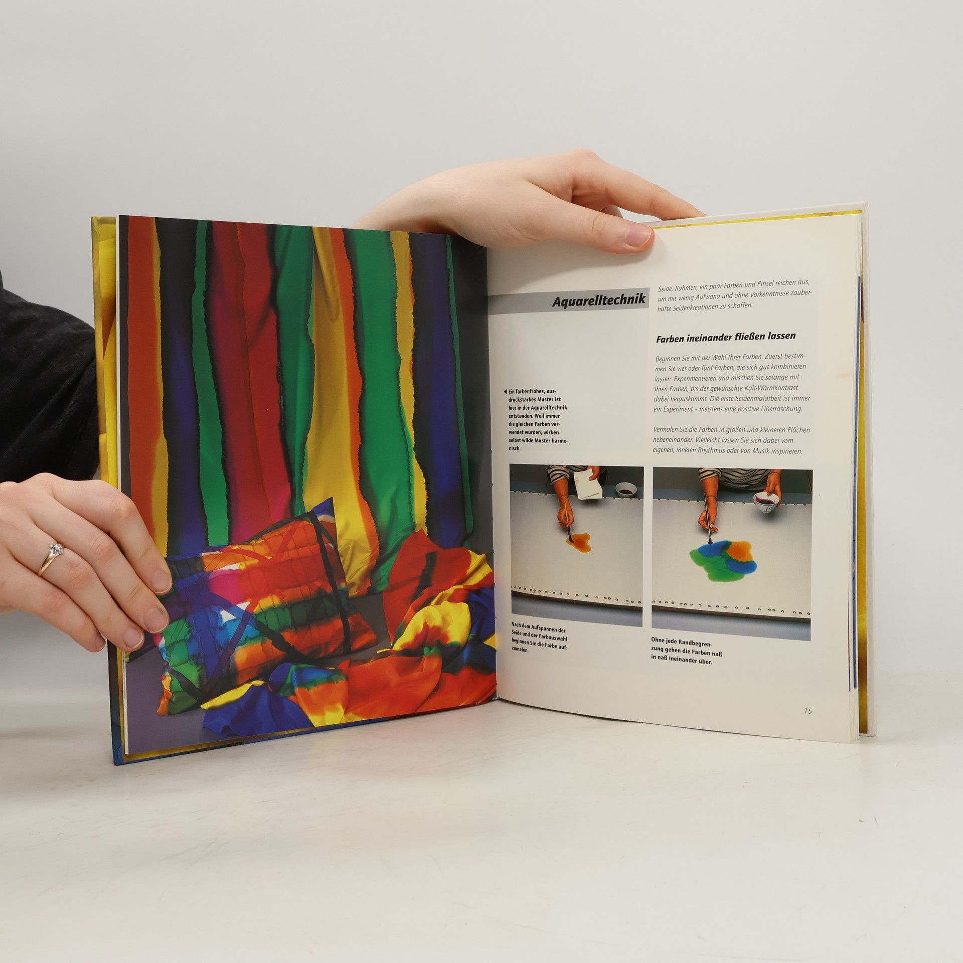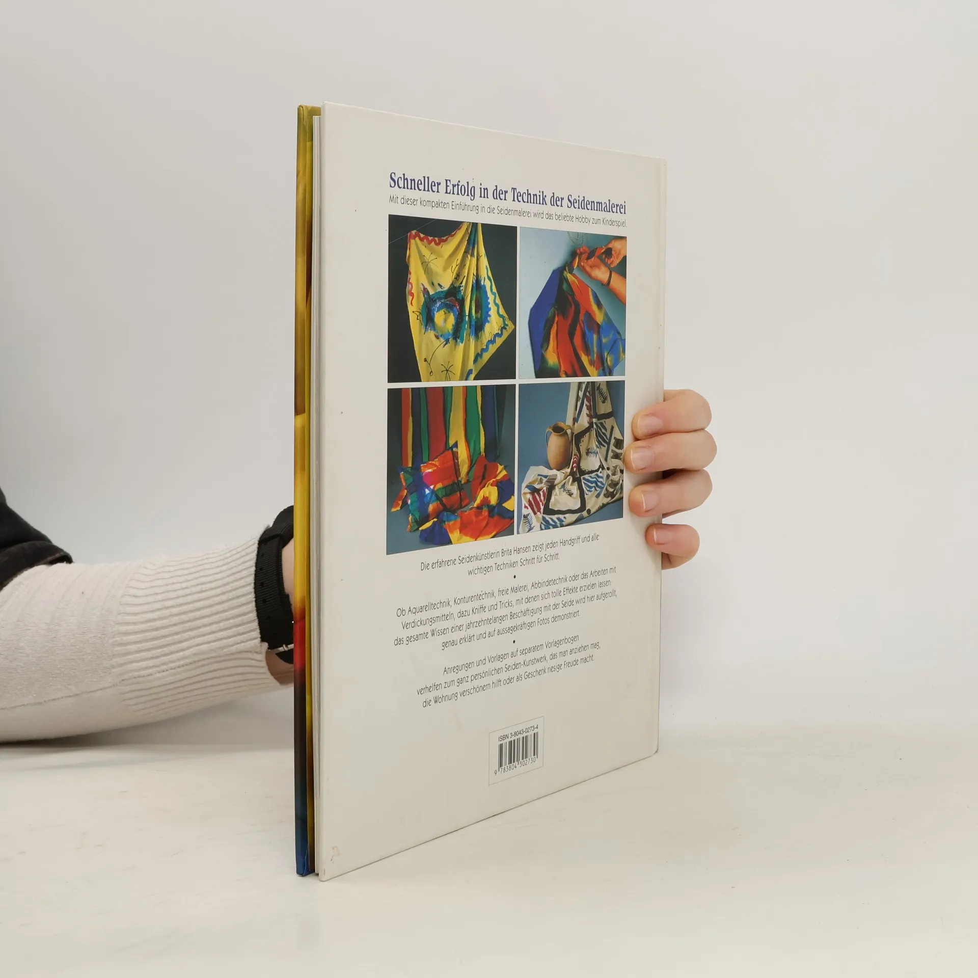 Für Anfänger und zum Auffrischen der technischen Grundkenntnisse hat die erfahrene Autorin einen hervorragenden Bildband mit knappem Info-Text zusammengestellt über alle Utensilien, Vorbereitungen und Nachbehandlungen sowie die wichtigsten Seidenmaltechniken mit ihren jeweils grundlegenden Ausgestaltungen: Aquarelltechniken des (Nass-in-nass-)Ineinanderfliessens, der grossen Farbflächen und "Aureolen", Salztechniken ohne und mit "Effekt", Auswaschtechniken mit Wasser oder Alkohol, Plissee-Effekte, Verdicktechnik und Konturentechniken mit Gutta oder Konturenfarbe. Wegen der Fülle des hervorragenden Bildmaterials neben "Seidenmalerei ..." der Verfasserin (BA 11/93), A. Orthaus: "Seidenmalerei: Grundtechniken ..." (BA 5/92) und H. Danner: "Techniken ..." (BA 9/88). (2 J)