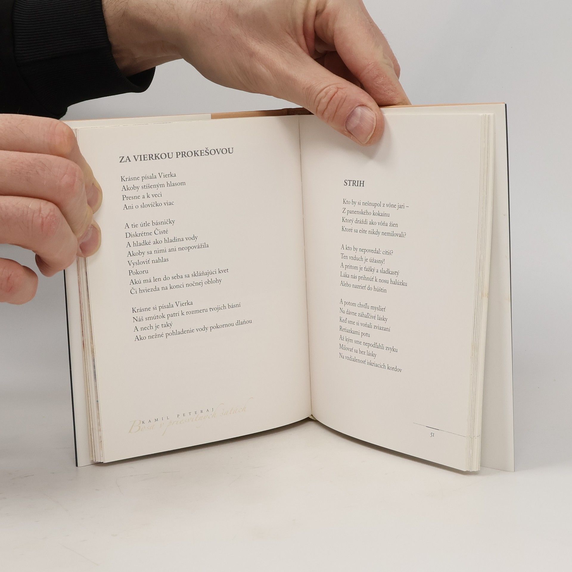 Knihy zažité a knihy ako pridaná hodnota bežnej knižnice. Knihy, ktoré milujeme po celý život, ale aj také, na ktoré zabudneme. Sú knihy, ktoré často citujeme, prenášame v duši z miesta na miesto, vláčime v duchovnom batohu, nosíme pri sebe ako modlitebné knižky, dychtivo odporúčame priateľom. Knihy voňajúce panenstvom neroztvorenia, papiera, rezby a tlače, vstupujúce do nášho života opatrne ako slušní hostia, ktorí už nikdy neopustia domácnosť. A sú aj knihy, ktoré vznikli takpovediac bokom, z nevyspytateľného chcenia náhody a možno aj autorského zámeru vyčistiť si hlavu či stôl.” Týmito slovami uvádza excelentný slovenský básnik, spisovateľ a textár Kamil Peteraj svoju novú básnickú zbierku Bosá v priesvitných šatách, ktorá obsahuje vyše šesťdesiat básní a sentencií a doplnená je originálnymi ilustráciami výtvarníka Martina Augustína. K čitateľovi sa tak dostáva krásna kniha, ktorá predstavuje symbiózu čistej poézie a výtvarného umenia.