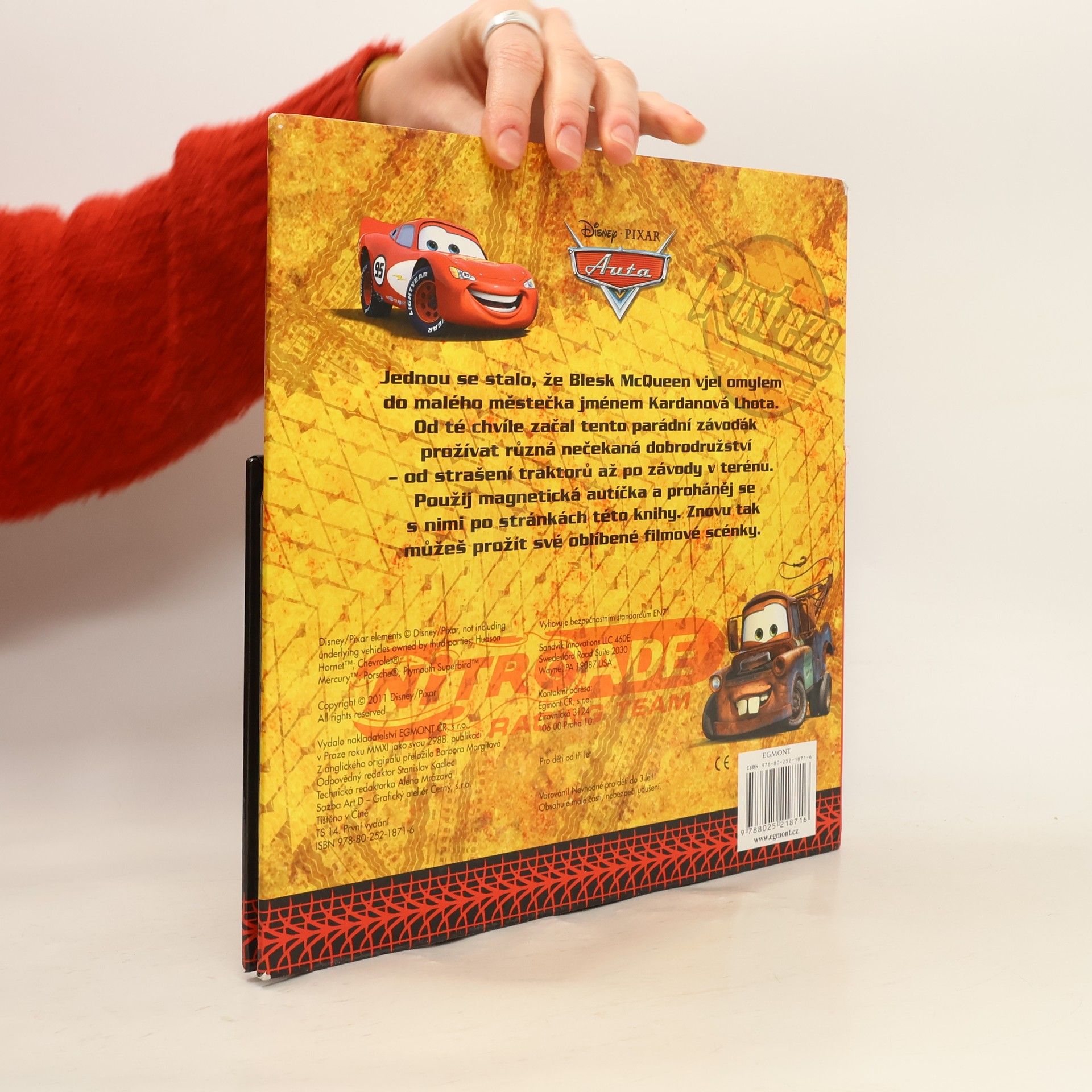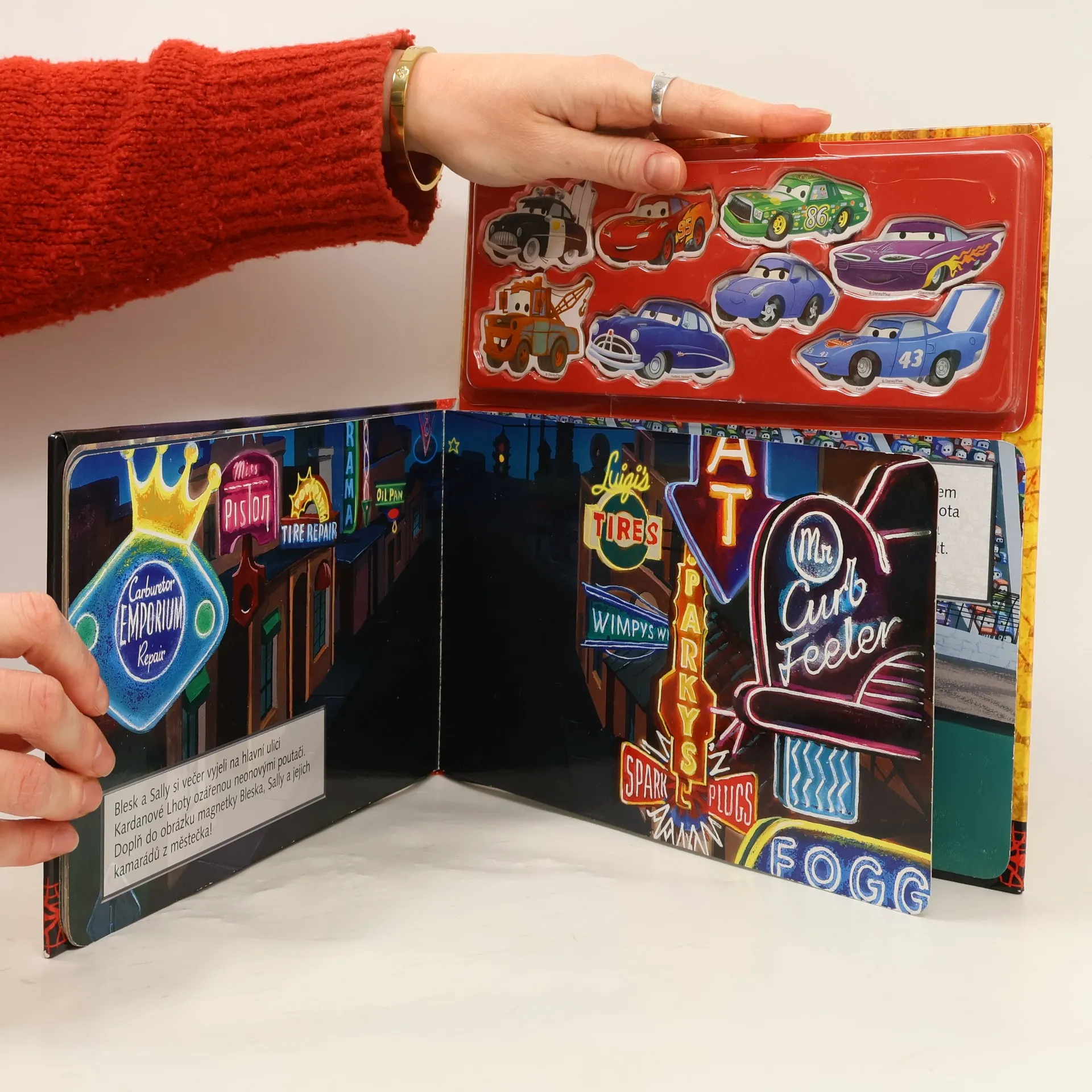 Magnetická kniha s hracími dílky. Jednou se stalo, že závoďák Blesk McQueen vjel omylem do malého ospalého městečka zvaného Kardanová Lhota. Od té chvíle začal prožívat různá nečekaná dobrodružství , od strašení traktorů až po závodění v terénu. Vezměte hrací dílky a prohánějte se s nimi po magnetických stránkách této knihy. Můžete vytvářet své oblíbené scénky z filmu, nebo úplně nové obrázky. Záleží jen na vaší fantazii!
