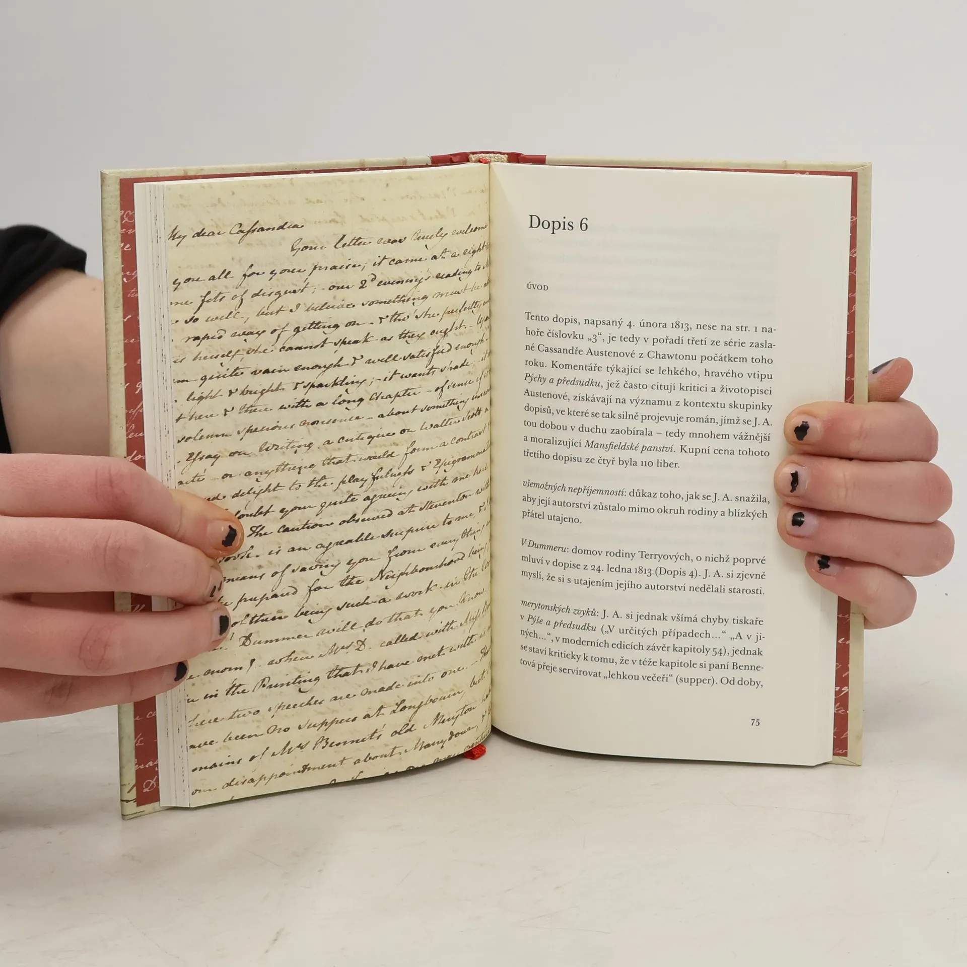 Třináct dopisů, které získalo Muzeum Jane Austenové, nám dává nahlédnout do soukromého i pracovního života této slavné a oblíbené anglické spisovatelky v letech 1801 až 1817. Dozvíme se něco z prostředí lázeňského města Bath, kde s rodinou pobývala až do roku 1805, kdy zemřel její otec. Její pozdější dopisy už jsou psány převážně z Chawtonu, kde s matkou, sestrou Cassandrou a Marthou Lloydovou žila téměř do své předčasné smrti. Najdeme v nich zajímavé i barvité postřehy z venkovského života, ale i mnohé poznámky týkající se vzniku a přijetí jejích děl, hlavně Pýchy a předsudku, Mansfieldského panství a Emmy. S těmito romány jsou spjaty i její pobyty v Londýně, kde dohlížela na jejich tisk a vydání. Vůbec nejdojemnější dopis, sepsaný pouhých pár dní po spisovatelčině smrti roku 1817, však pochází z pera její milované sestry Cassandry. Každý dopis je opatřen úvodem a poznámkami, které vysvětlují, co by dnešnímu čtenáři mohlo případně unikat.
