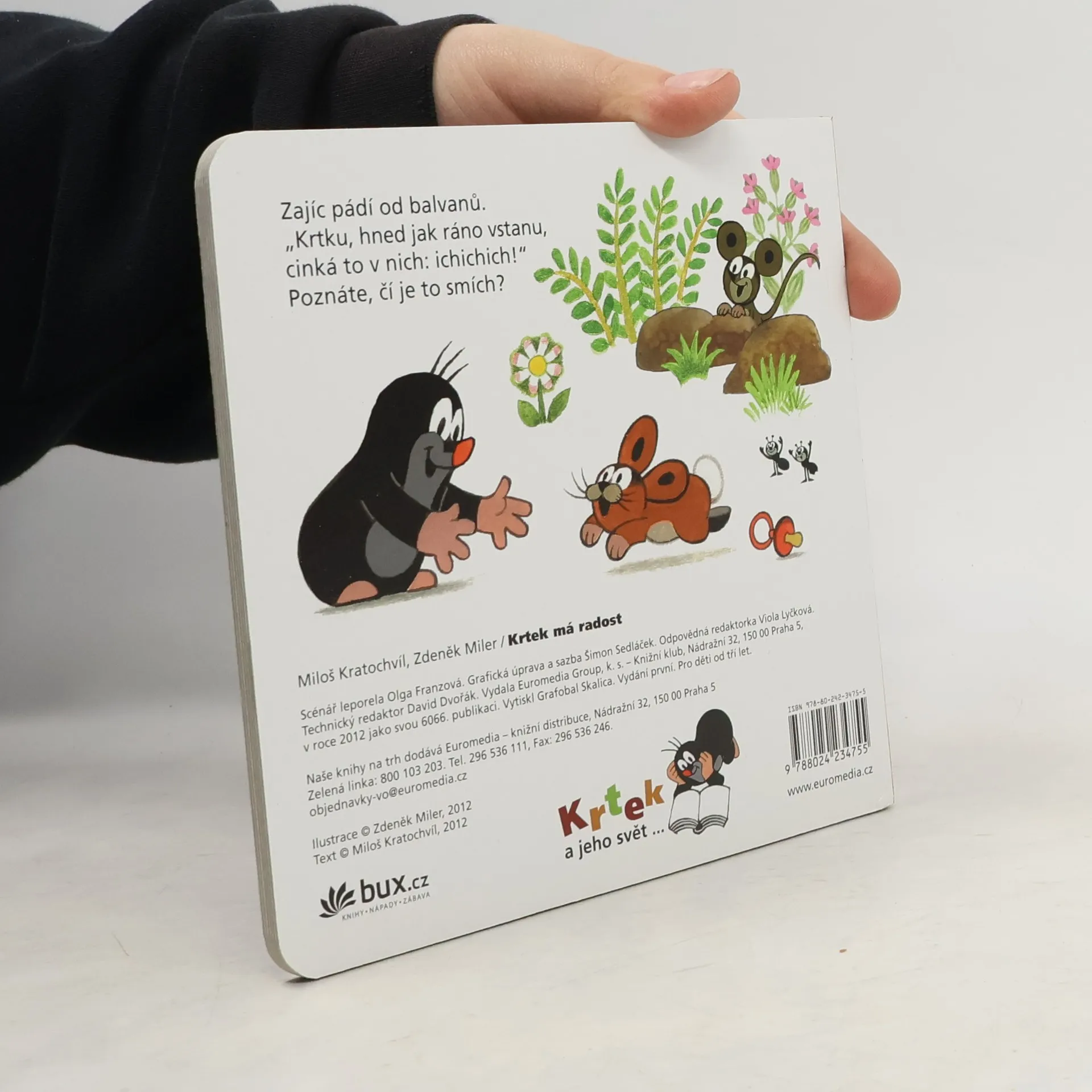 Desátý z řady příběhů pro nejmenší čtenáře o tom, co všechno umí neposedný krteček a jeho zvířecí kamarádi, je zaměřen na základní pocity, se kterými se děti setkávají v kontaktu s vrstevníky i se světem dospělých. I hodného Krtka spousta věcí dokáže potěšit, rozzlobit, rozesmutnit, vyděsit, a někdy je potřeba někomu i vyčinit! Doplněno návodnými otázkami.