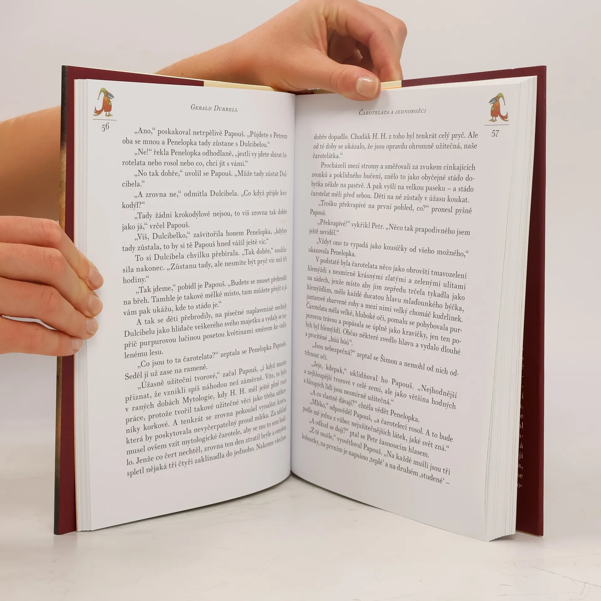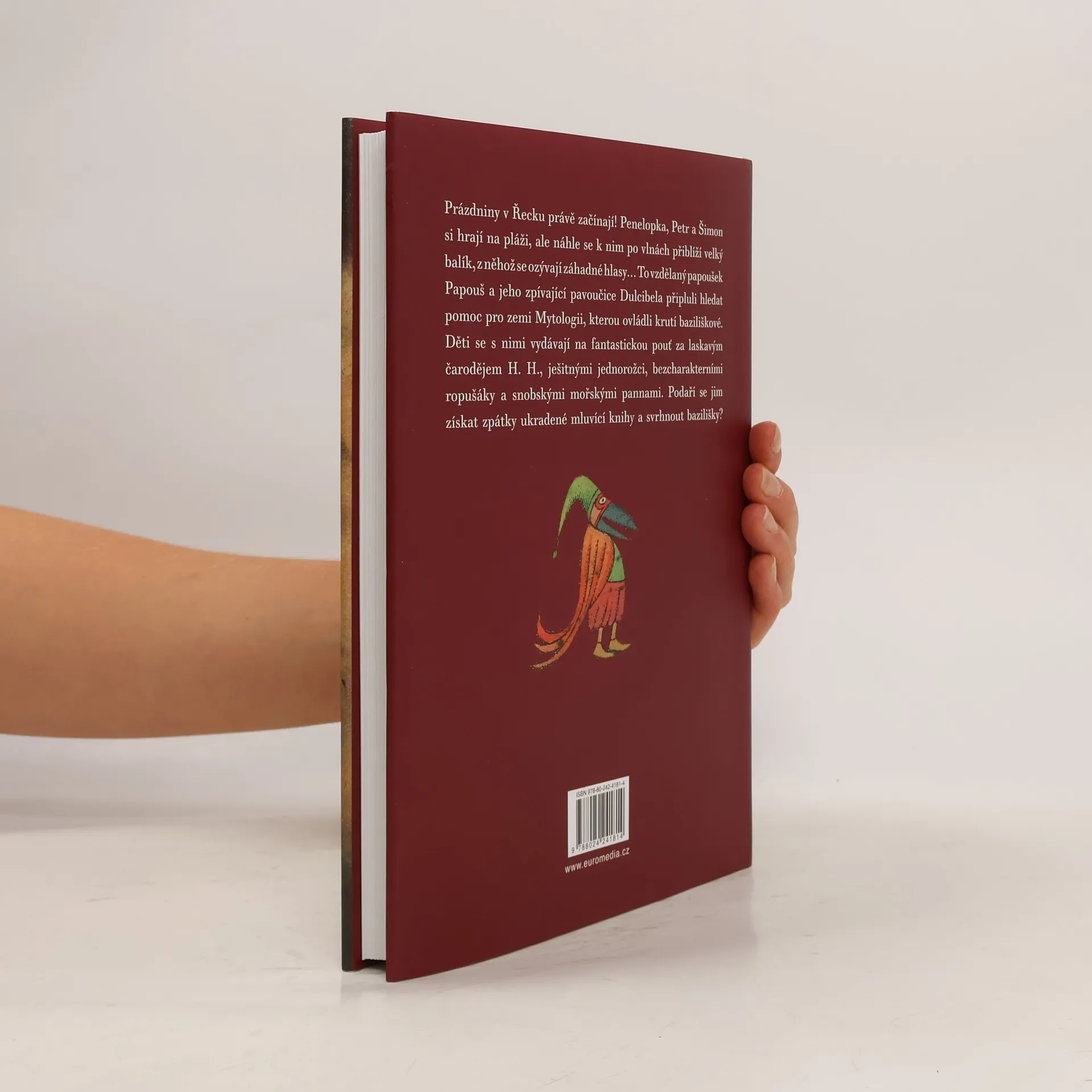 Prázdniny v Řecku právě začínají! Penelopka, Petr a Šimon si hrají na pláži, ale náhle se k nim po vlnách přiblíží velký balík, z něhož se ozývají záhadné hlasy... To vzdělaný papoušek Papouš a jeho zpívající pavoučice Dulcibela připluli hledat pomoc pro zemi Mytologii, kterou ovládli krutí baziliškové. Děti se s nimi vydávají na fantastickou pouť za laskavým čarodějem H. H., ješitnými jednorožci, bezcharakterními ropušáky a snobskými mořskými pannami. Podaří se jim získat zpátky ukradené mluvící knihy a svrhnout bazilišky? Půvabný pohádkový příběh pro děti z pera autora oblíbených příběhů o zvířatech (O mé rodině a jiné zvířeně, Chytněte mi guerézu, Ptáci, zvířata a moji příbuzní).