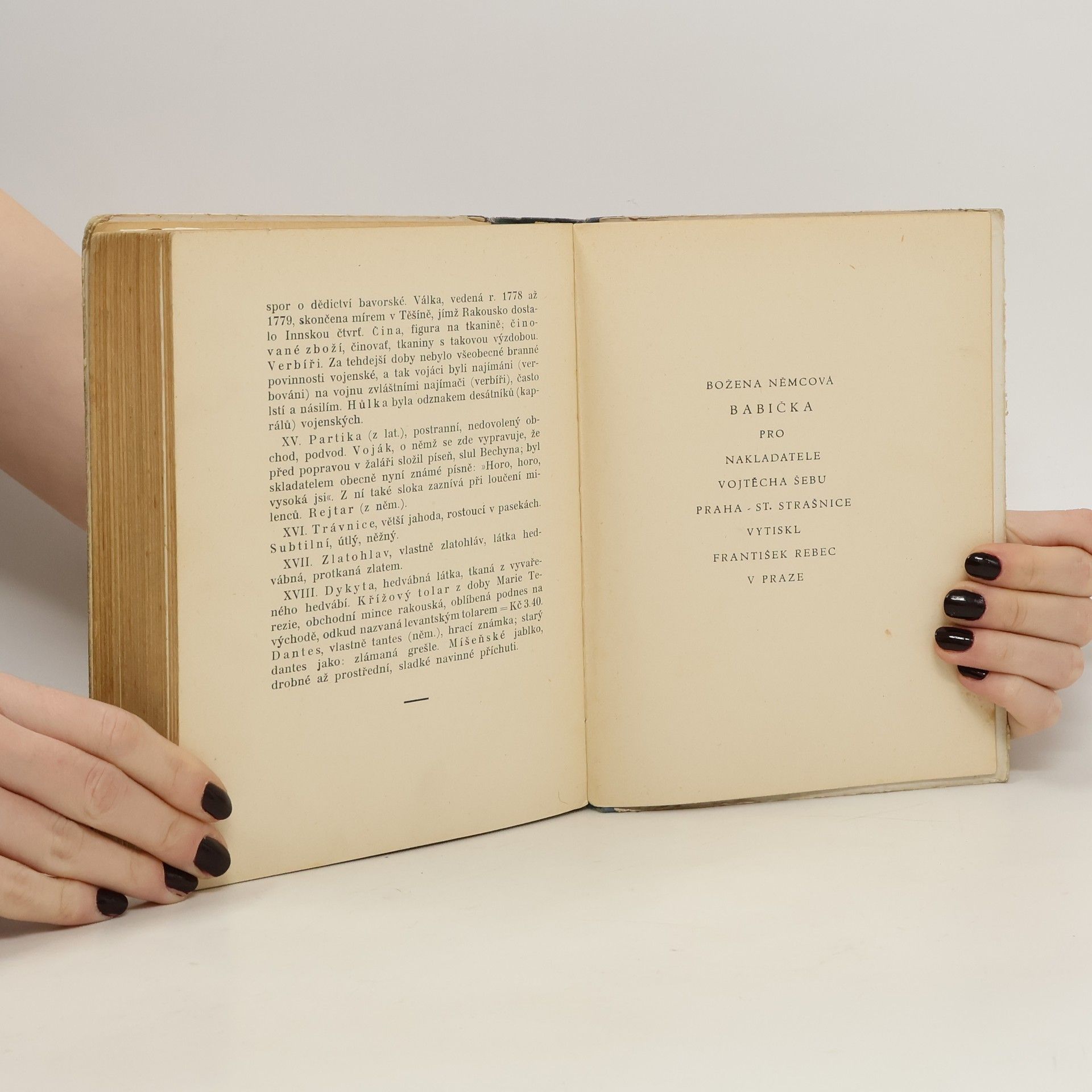Nejznámější prózu Boženy Němcové jistě netřeba blíže představovat - patří k nejčtenějším českým knihám. Poprvé vyšla v roce 1855 a od té doby byla publikována ve více než třech stovkách českých vydání a v mnoha zahraničních překladech. Své vzpomínky na dětství, prožité v ratibořickém údolí s babičkou Magdalénou Novotnou, autorka přetavila do částečně idealizované, ale přesto realistické podoby.