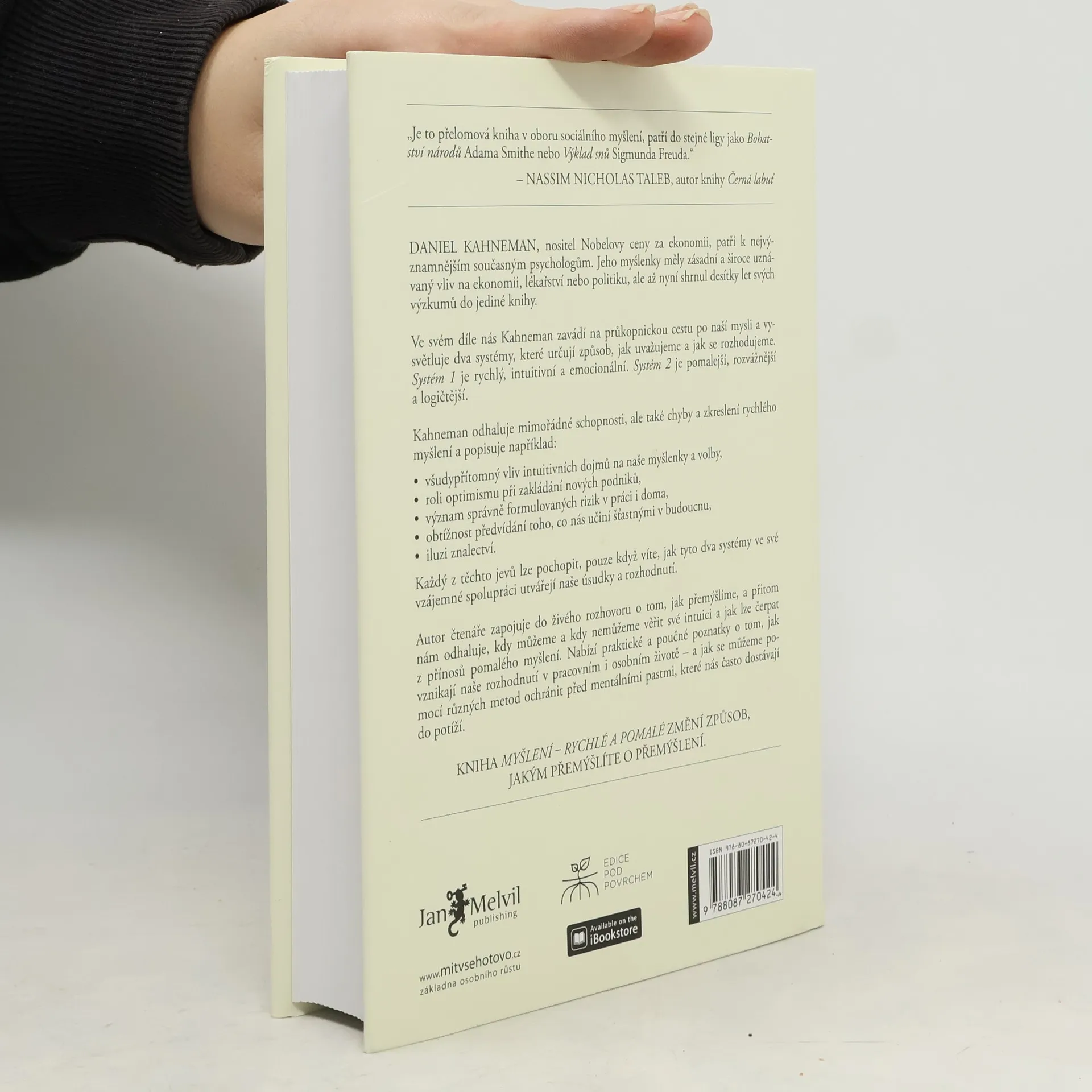 Daniel Kahneman, psycholog, držitel Nobelovy ceny za ekonomii, nás v průlomové práci, označované Nassimem Talebem za stejně významné dílo, jakým byl kdysi Freudův „Výklad snů“, seznamuje se dvěma systémy, které řídí to, jak přemýšlíme a jak se rozhodujeme. Systém 1 je rychlý, intuitivní a emocionální. Systém 2 je pomalý, váhavý a logický. Poutavý průvodce myslí nás ve čtivé knize vtahuje do dialogu o tom, jak přemýšlíme, a přitom odhaluje, v kterých situacích můžeme a kdy naopak nesmíme věřit své intuici (Systém 1) a také kdy a jak čerpat z přínosu pomalého myšlení (Systém 2). Nabízí praktické i poučné poznatky o tom, jak vznikají naše rozhodnutí v pracovním i osobním životě – a hlavně návod na to, jak se vyvarovat chyb.