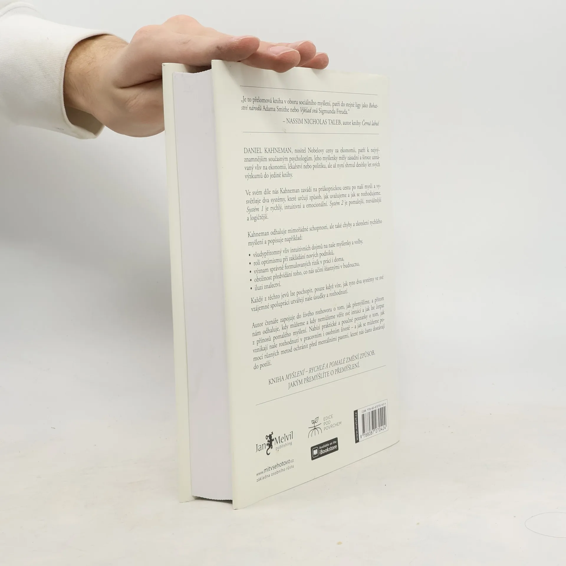 Daniel Kahneman, psycholog, držitel Nobelovy ceny za ekonomii, nás v průlomové práci, označované Nassimem Talebem za stejně významné dílo, jakým byl kdysi Freudův „Výklad snů“, seznamuje se dvěma systémy, které řídí to, jak přemýšlíme a jak se rozhodujeme. Systém 1 je rychlý, intuitivní a emocionální. Systém 2 je pomalý, váhavý a logický. Poutavý průvodce myslí nás ve čtivé knize vtahuje do dialogu o tom, jak přemýšlíme, a přitom odhaluje, v kterých situacích můžeme a kdy naopak nesmíme věřit své intuici (Systém 1) a také kdy a jak čerpat z přínosu pomalého myšlení (Systém 2). Nabízí praktické i poučné poznatky o tom, jak vznikají naše rozhodnutí v pracovním i osobním životě – a hlavně návod na to, jak se vyvarovat chyb.