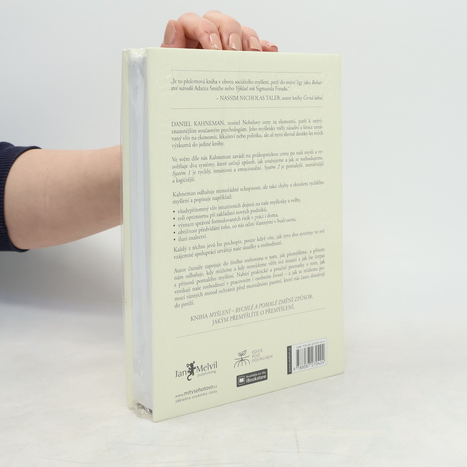 Daniel Kahneman, psycholog, držitel Nobelovy ceny za ekonomii, nás v průlomové práci, označované Nassimem Talebem za stejně významné dílo, jakým byl kdysi Freudův „Výklad snů“, seznamuje se dvěma systémy, které řídí to, jak přemýšlíme a jak se rozhodujeme. Systém 1 je rychlý, intuitivní a emocionální. Systém 2 je pomalý, váhavý a logický. Poutavý průvodce myslí nás ve čtivé knize vtahuje do dialogu o tom, jak přemýšlíme, a přitom odhaluje, v kterých situacích můžeme a kdy naopak nesmíme věřit své intuici (Systém 1) a také kdy a jak čerpat z přínosu pomalého myšlení (Systém 2). Nabízí praktické i poučné poznatky o tom, jak vznikají naše rozhodnutí v pracovním i osobním životě – a hlavně návod na to, jak se vyvarovat chyb.