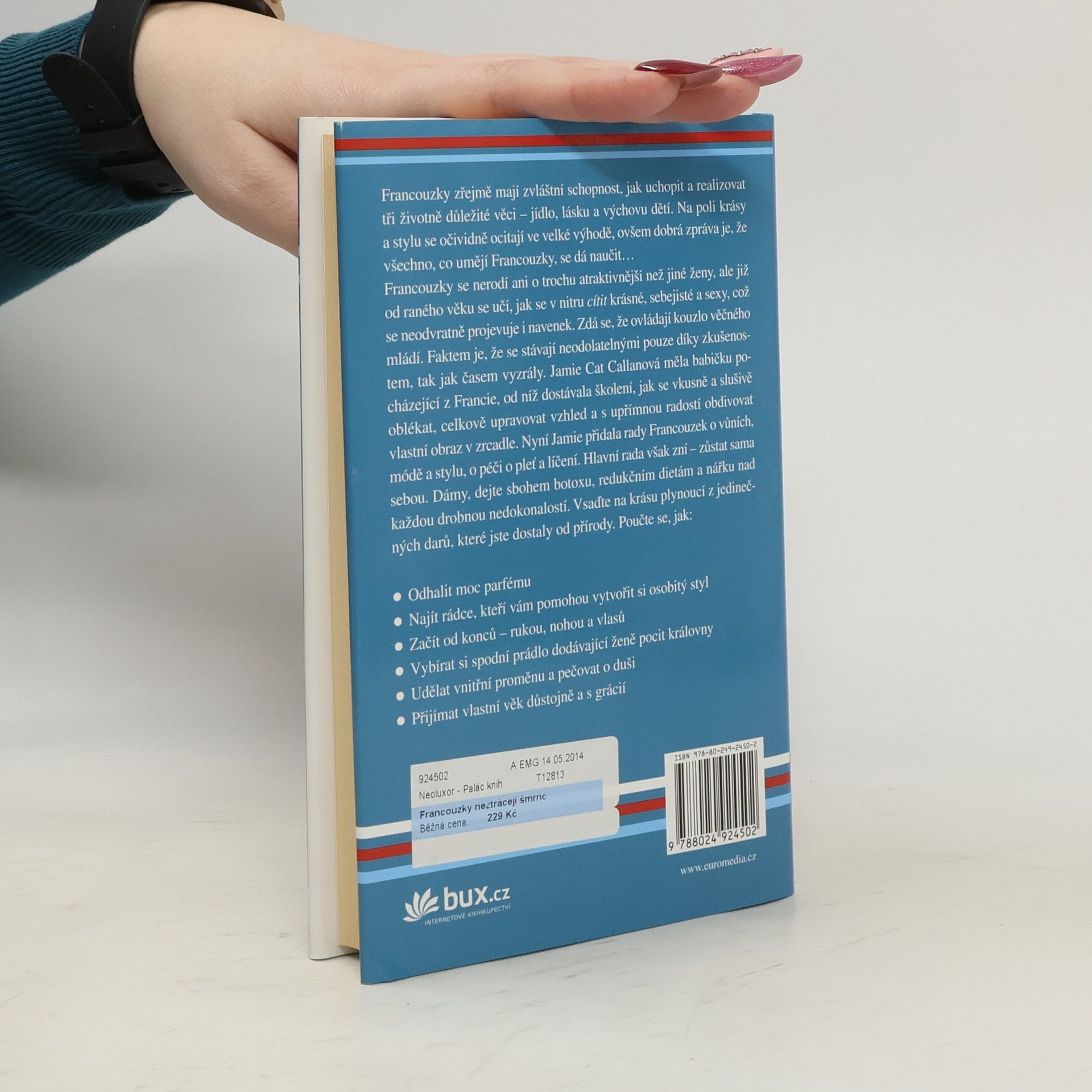 Dámy, dobrá zpráva je, že všechno, co umějí Francouzky, se můžete naučit. Zdá se, že ovládají kouzlo věčného mládí. V nové knize Jamie shromáždila rady Francouzek o vůních, módě a stylu, o péči o pleť a líčení: jak odhalit moc parfému, vytvořit si osobitý styl, začít od rukou, nohou a vlasů, vybírat si božské spodní prádlo, udělat vnitřní proměnu a přijímat vlastní věk s grácií. Dejte sbohem botoxu, redukčním dietám a pláči nad každou drobnou nedokonalostí. Vsaďte na krásu plynoucí z darů, které jste dostaly od přírody.
