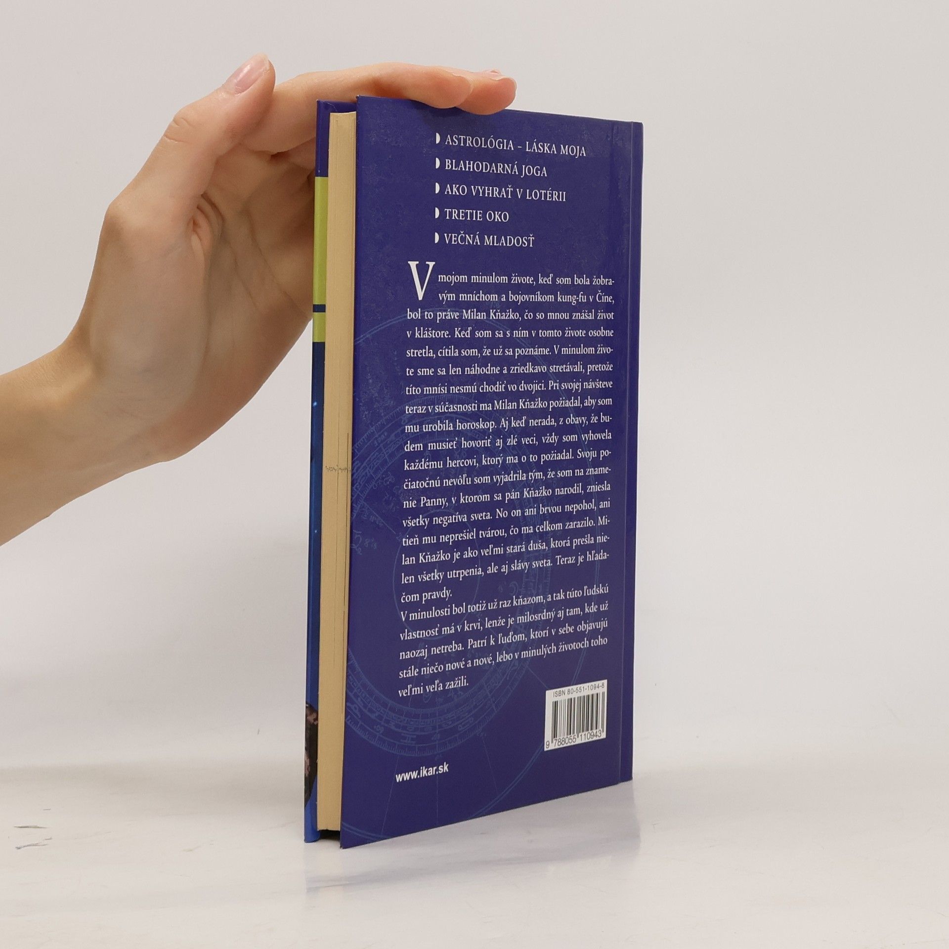 V mojom minulom živote, keď som bola žobravým mníchom a bojovníkom kung-fu v Číne, bol to práve Milan Kňažko, čo so mnou znášal život v kláštore. Keď som sa s ním v tomto živote osobne stretla, cítila som, že už sa poznáme. V minulom živote sme sa len náhodne a zriedkavo stretávali, pretože títo mnísi nesmú chodiť vo dvojici. Pri svojej návšteve teraz v súčasnosti ma Milan Kňažko požiadal, aby som mu urobila horoskop. Aj keď nerada, z obavy, že budem musieť hovoriť aj zlé veci, vždy som vyhovela každému hercovi, ktorý ma o to požiadal. Svoju počiatočnú nevôľu som vyjadrila tým, že som na znamenie Panny, v ktorom sa pán Kňažko narodil, zniesla všetky negatíva sveta. No on ani brvou nepohol, ani tieň mu neprešiel tvárou, čo ma celkom zarazilo. Milan Kňažko je ako veľmi stará duša, ktorá prešla nielen všetky utrpenia, ale aj slávy sveta. Teraz je hľadačom pravdy. V minulosti bol totiž už raz kňazom, a tak túto ľudskú vlastnosť má v krvi, lenže je milosrdný aj tam, kde už naozaj netreba. Patrí k ľuďom, ktorí v sebe objavujú stále niečo nové a nové, lebo v minulých životoch toho veľmi veľa zažili.