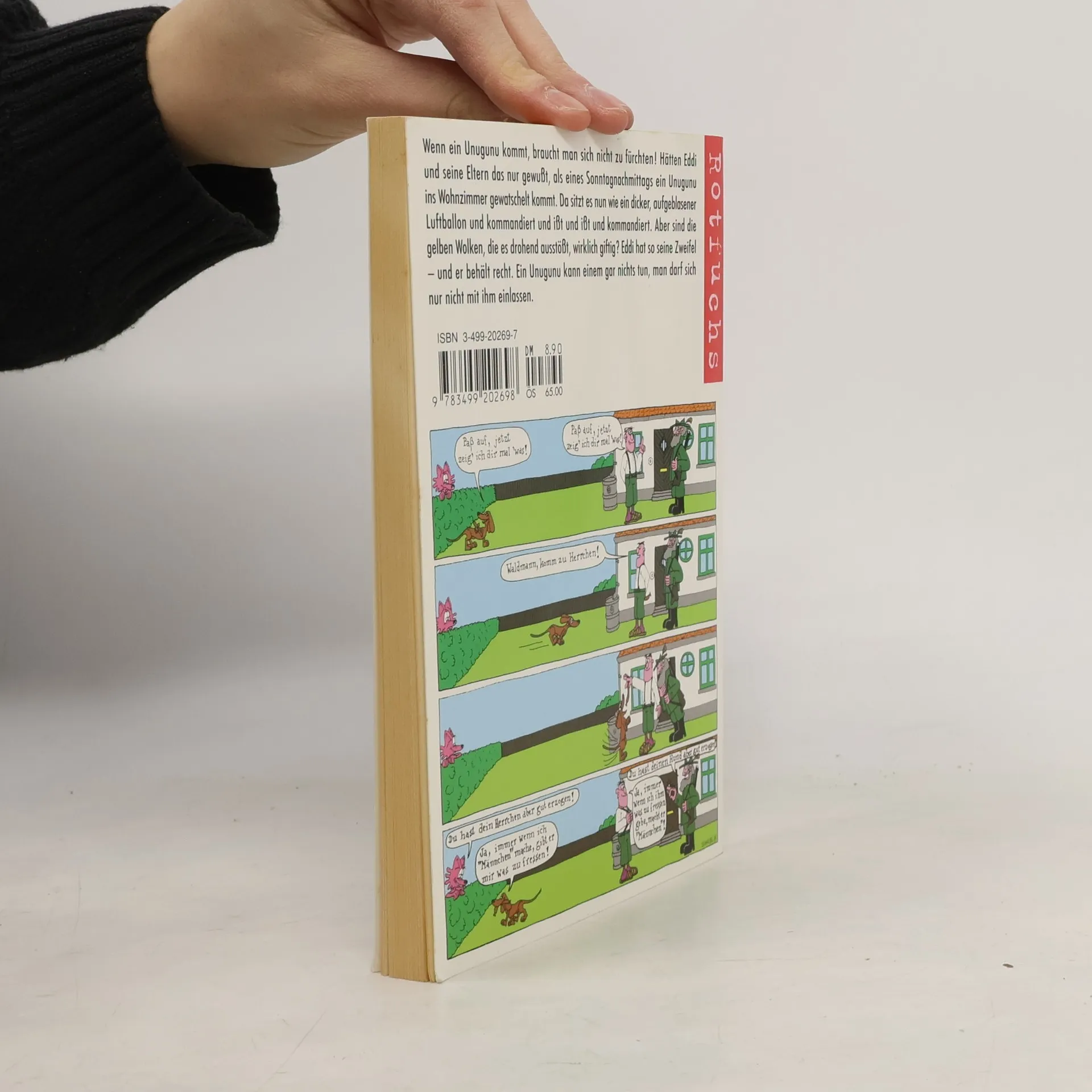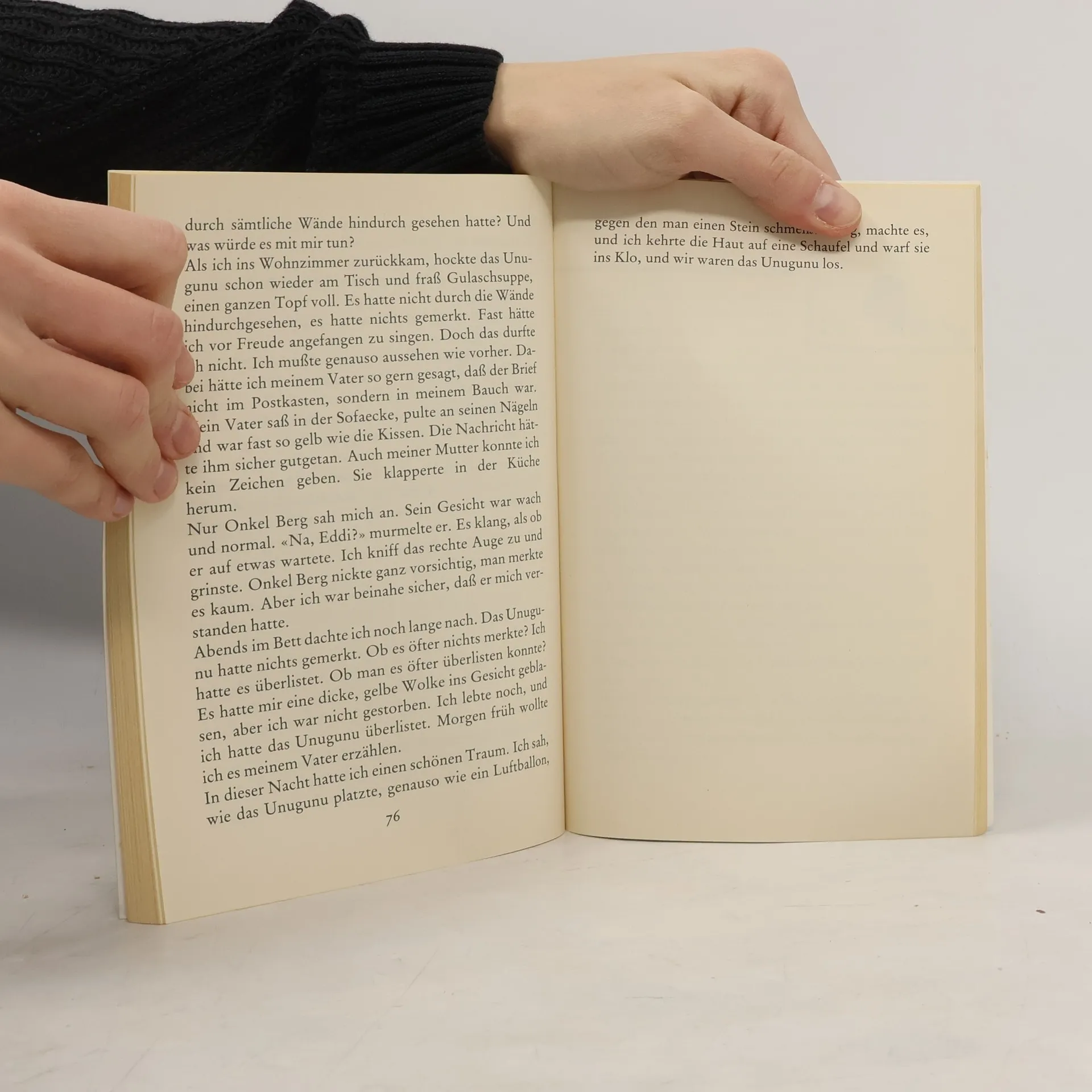 Eines Sonntagnachmittags klingelt es bei Eddi und seinen Eltern, und ein Unugunu kommt ins Wohnzimmer gewatschelt. Auf dem bequemsten Sessel sitzt es nun da, dick und aufgeblasen wie ein Luftballon. Eine schreckliche Zeit beginnt für die Schnohrs – das Unugunu kommandiert und isst und isst und kommandiert . . . aber sind die gelben Wolken, die es drohend ausstößt, wirklich giftig?