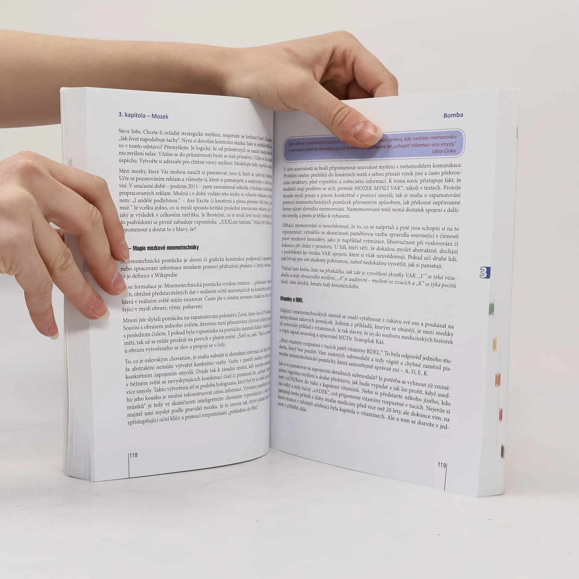 Autor knihy nabízí cenné know-how, s jehož pomocí studenti překonají problémy při učení a získají dokonalý domácí výukový nástroj pro cizí jazyky. Pomocí užitečných technik pro trénink paměti si snadno zapamatujete desítky údajů, které mohou být klíčové pro vaši profesi. Naučíte se nezapomínat, co všechno jste chtěli říci a vyřídit při obchodním jednání. Naučíte se číst neuvěřitelně rychle a přesto si pamatovat lépe.