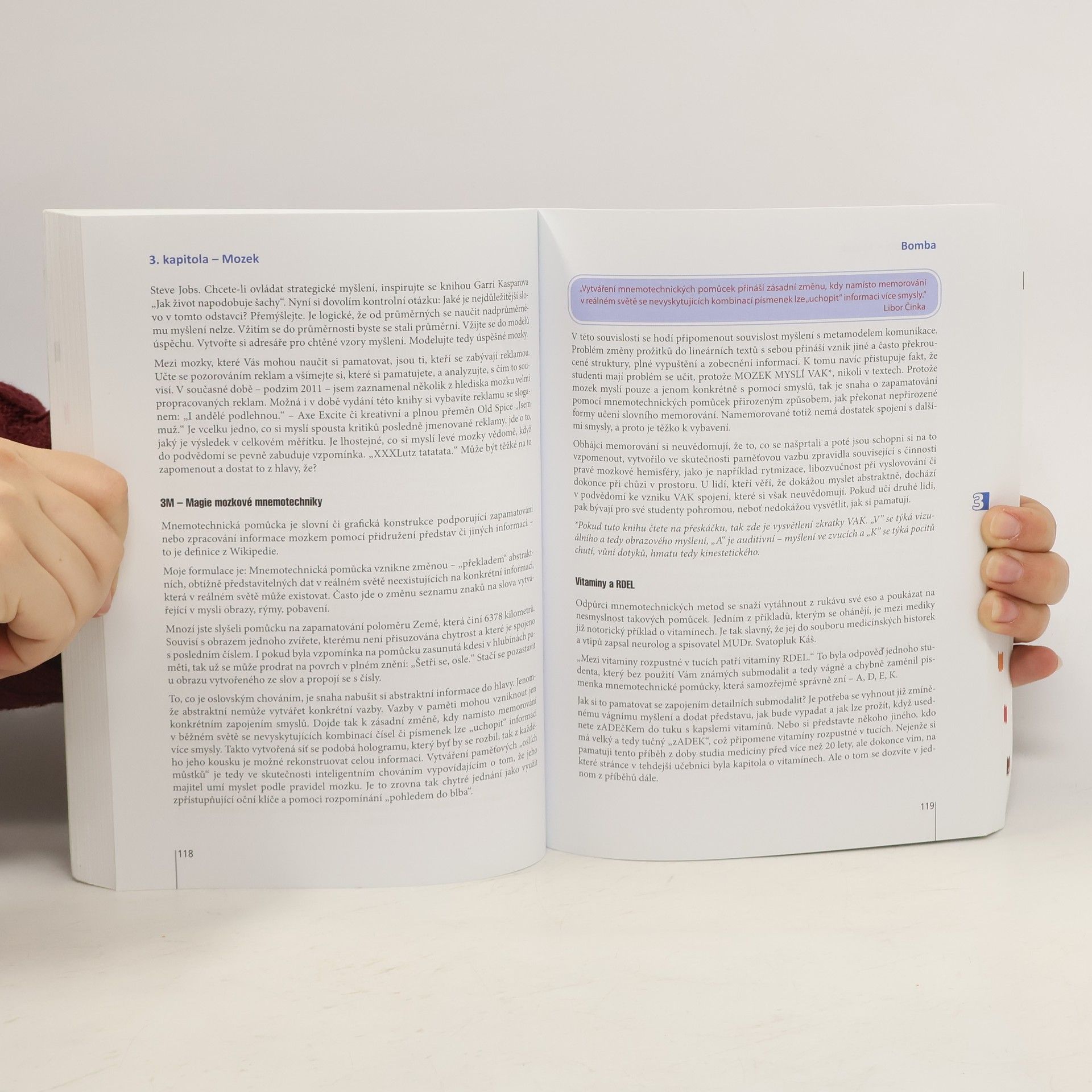 Autor knihy nabízí cenné know-how, s jehož pomocí studenti překonají problémy při učení a získají dokonalý domácí výukový nástroj pro cizí jazyky. Pomocí užitečných technik pro trénink paměti si snadno zapamatujete desítky údajů, které mohou být klíčové pro vaši profesi. Naučíte se nezapomínat, co všechno jste chtěli říci a vyřídit při obchodním jednání. Naučíte se číst neuvěřitelně rychle a přesto si pamatovat lépe.