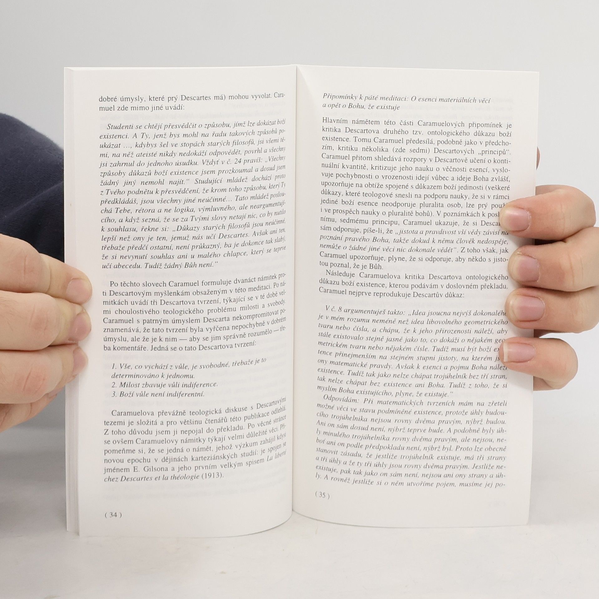 Ohlas Descartových spisů v českých zemích je spojen především se jménem emauzského opata Jana Caramuela z Lobkovic. Napsal obsáhlé Připomínky ke karteziánským Meditacím , jejichž rukopis byl nedávno objeven a vydán v Itálii. Publikace obsahuje překlad vybraných částí Připomínek, Caramuelův životopis, komentář a úvahu o celkovém rázu recepce karteziánství v 17. století v našem prostředí.