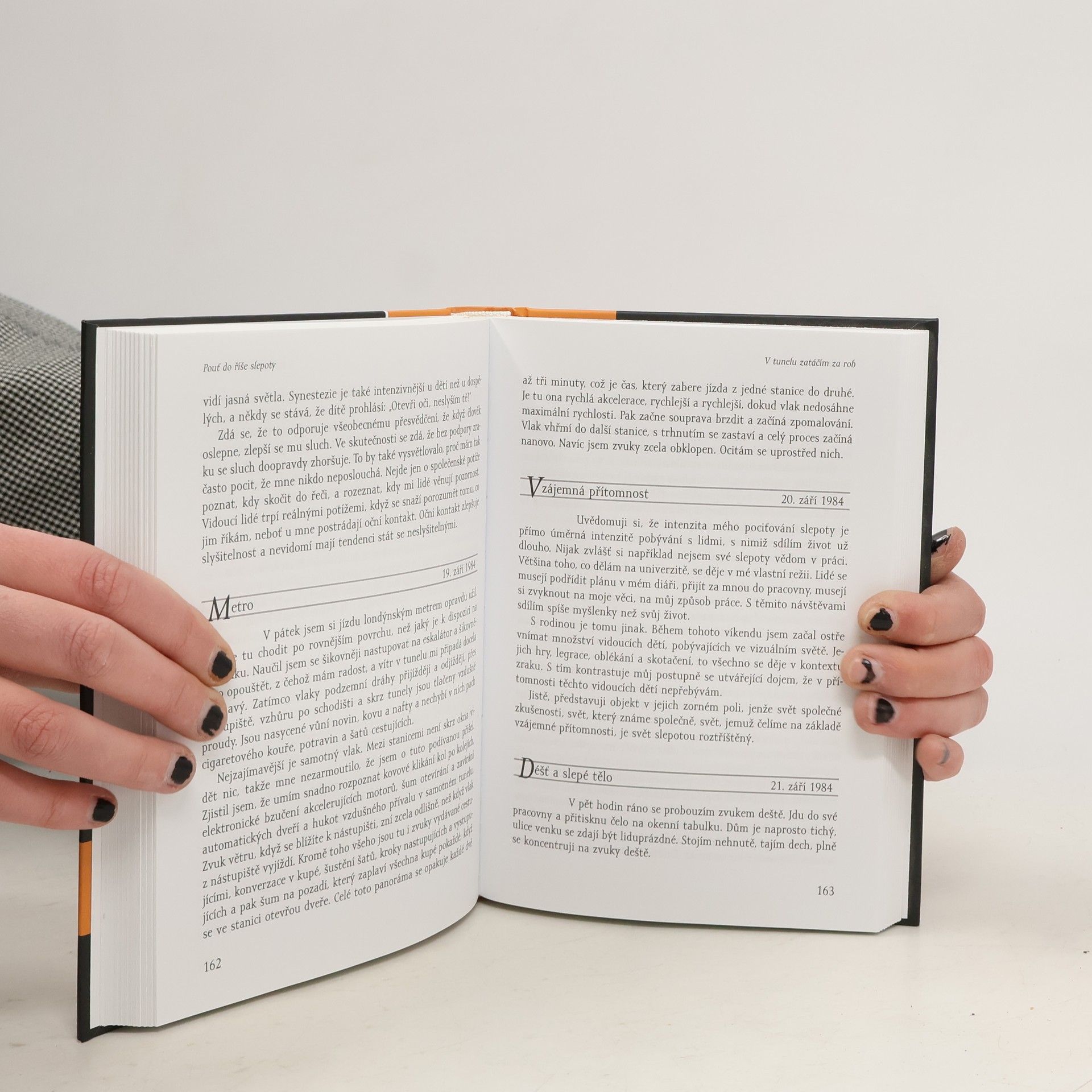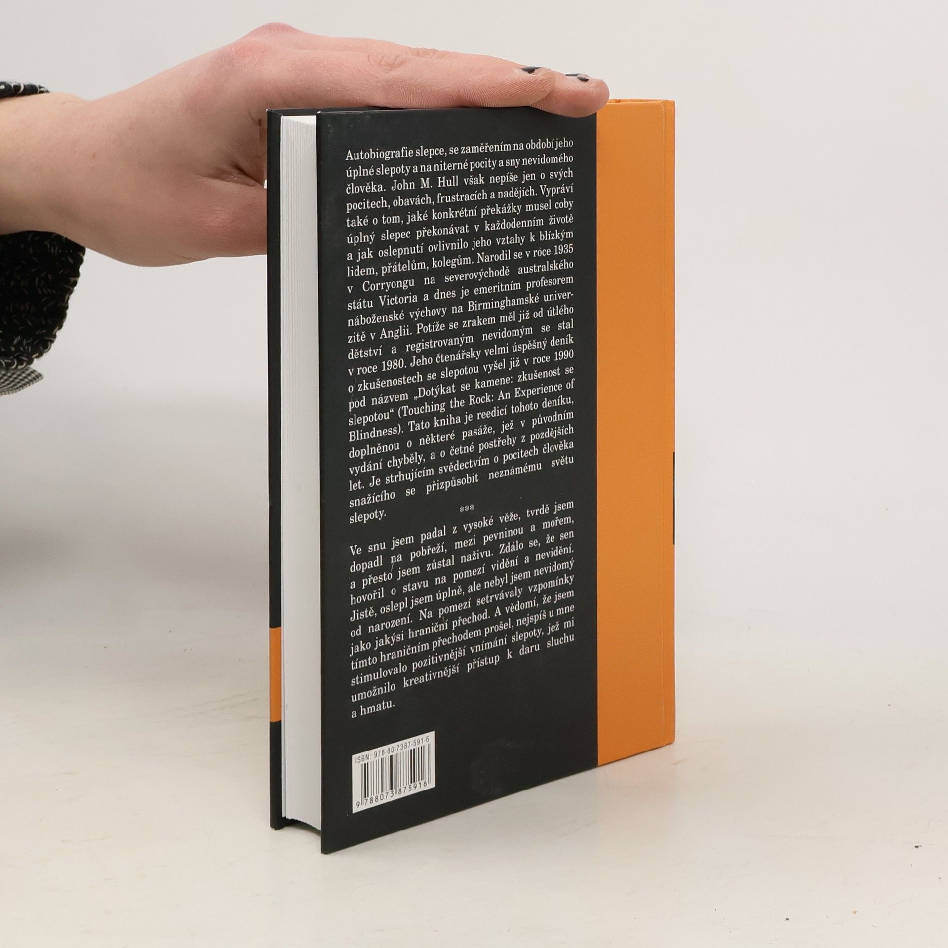 Autobiografie slepce, se zaměřením na období jeho úplné slepoty a na niterné pocity a sny nevidomého člověka. John M. Hull však nepíše jen o svých pocitech, obavách, frustracích a nadějích. Vypráví také o tom, jaké konkrétní překážky musel coby úplný slepec překonávat v každodenním životě a jak oslepnutí ovlivnilo jeho vztahy k blízkým lidem, přátelům, kolegům. Narodil se 22. dubna 1935 v Corryongu na severovýchodě australského státu Victoria a dnes je emeritním profesorem náboženské výchovy na Birminghamské univerzitě v Anglii. Potíže se zrakem měl již od útlého dětství a registrovaným nevidomým se stal v roce 1980. Jeho čtenářsky velmi úspěšný deník o zkušenostech se slepotou vyšel již v roce 1990 pod názvem „Dotýkat se kamene: zkušenost se slepotou“ (Touching the Rock: An Experience of Blindness). Tato kniha je reedicí tohoto deníku, doplněnou o některé pasáže, jež v původním vydání chyběly, a o četné postřehy z pozdějších let. Je strhujícím svědectvím o pocitech člověka snažícího se přizpůsobit neznámému světu slepoty.