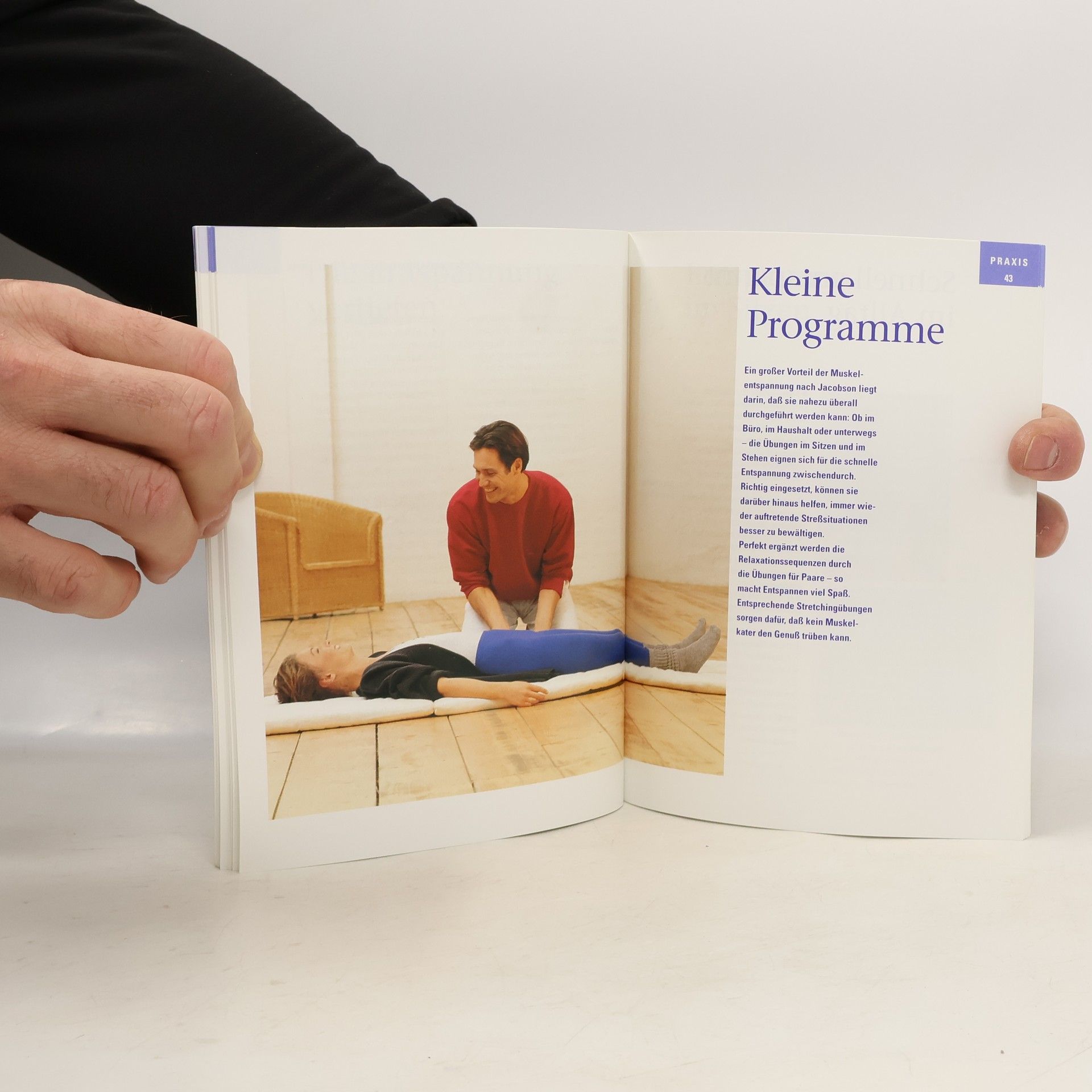 Enthält Übungsanleitungen für das Wechselspiel von Dehnen und Entspannen, wobei der fortschreitende Entspannungsprozess alle körperlichen Bereiche und insbesondere die Psyche beeinflussen soll.