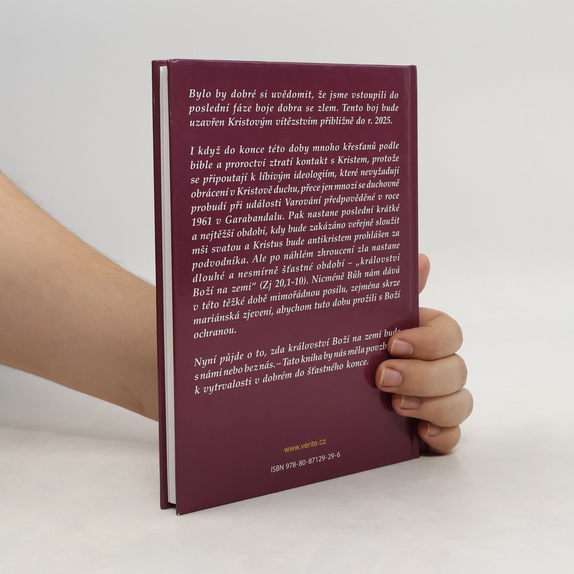 Bylo by dobré si uvědomit, že jsme vstoupili do poslední fáze boje dobra se zlem. Tento boj bude uzavřen Kristovým vítězstvím přibližně do r. 2025. I když do konce této doby mnoho křesťanů podle bible a proroctví ztratí kontakt s Kristem, protože se připoutají k líbivým ideologiím, které nevyžadují obrácení v Kristově duchu, přece jen mnozí se duchovně probudí při události Varování předpověděné v roce 1961 v Garabandalu. Pak nastane poslední krátké a nejtěžší období, kdy bude zakázáno veřejně sloužit mši svatou a Kristus bude antikristem prohlášen za podvodníka. Ale po náhlém zhroucení zla nastane dlouhé a nesmírně šťastné období – „království Boží na zemi“ (Zj 20,1-10). Nicméně Bůh nám dává v této těžké době mimořádnou posilu, zejména skrze mariánská zjevení, abychom tuto dobu prožili s Boží ochranou. Nyní půjde o to, zda království Boží na zemi bude s námi nebo bez nás. – Tato kniha by nás měla povzbudit k vytrvalosti v dobrém do šťastného konce.