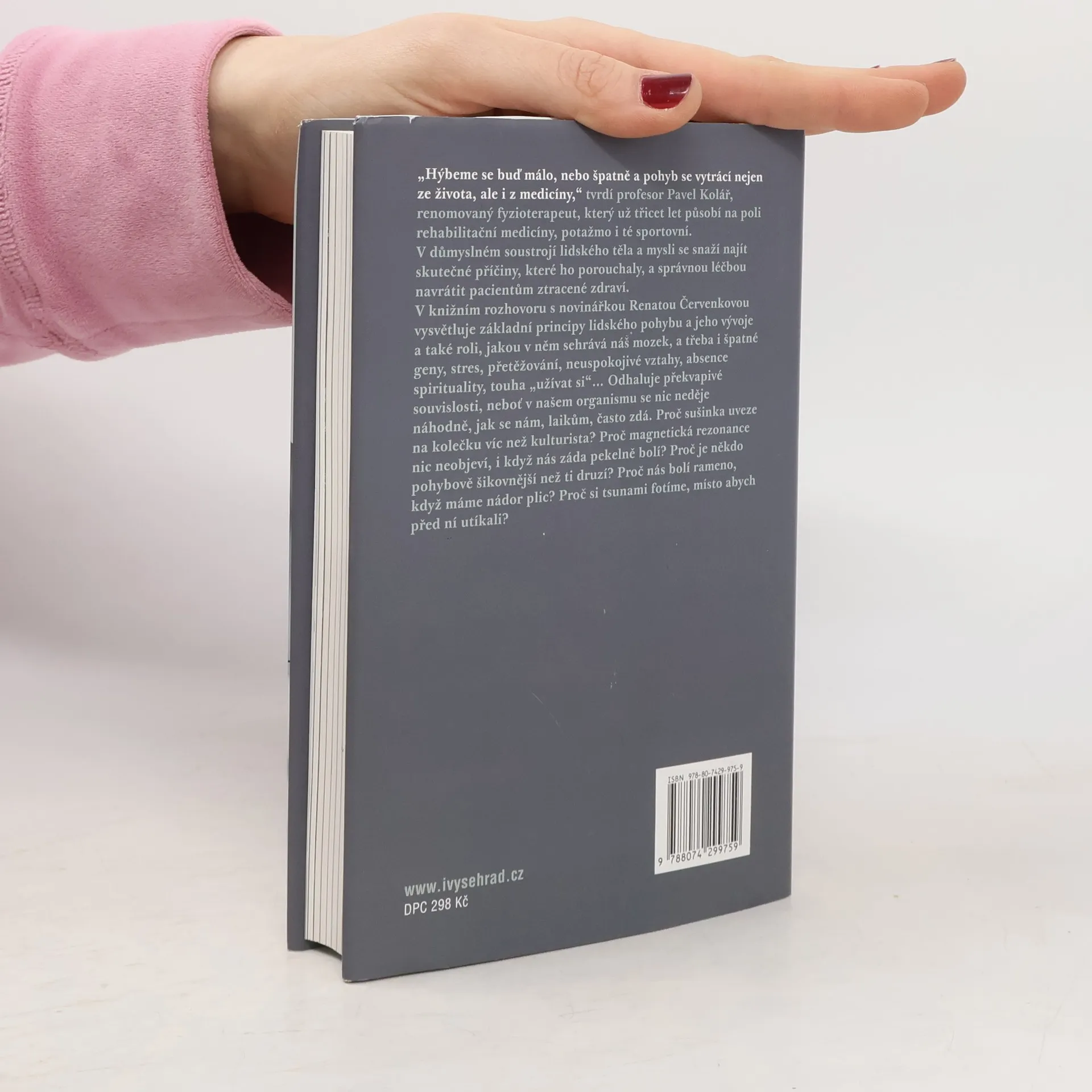 Knižní rozhovor s renomovaným fyzioterapeutem prof. Kolářem. „Hýbeme se buď málo, nebo špatně a pohyb se vytrácí nejen ze života, ale i z medicíny,“ tvrdí profesor Pavel Kolář, renomovaný fyzioterapeut, který už třicet let působí na poli rehabilitační medicíny, potažmo i té sportovní. V důmyslném soustrojí lidského těla a mysli se snaží najít skutečné příčiny, které ho porouchaly, a správnou léčbou navrátit pacientům ztracené zdraví. V rozhovorech s novinářkou Renátou Červenkovou vysvětluje základní principy lidského pohybu a jeho vývoje a také roli, jakou v něm sehrává náš mozek a třeba i špatné geny, stres, přetěžování, neuspokojivé vztahy, absence spirituality, touha „užívat si“... Odhaluje překvapivé souvislosti, neboť v našem organismu se nic neděje náhodně, jak se nám, laikům, často zdá. Proč nás bolí rameno, když máme nádor plic? Proč sušinka uveze na kolečku víc než kulturista? Proč magnetická rezonance nic neobjeví, i když nás záda pekelně bolí? Proč je někdo pohybově šikovnější než ti druzí? Proč si tsunami fotíme, místo abychom před ní utíkali?