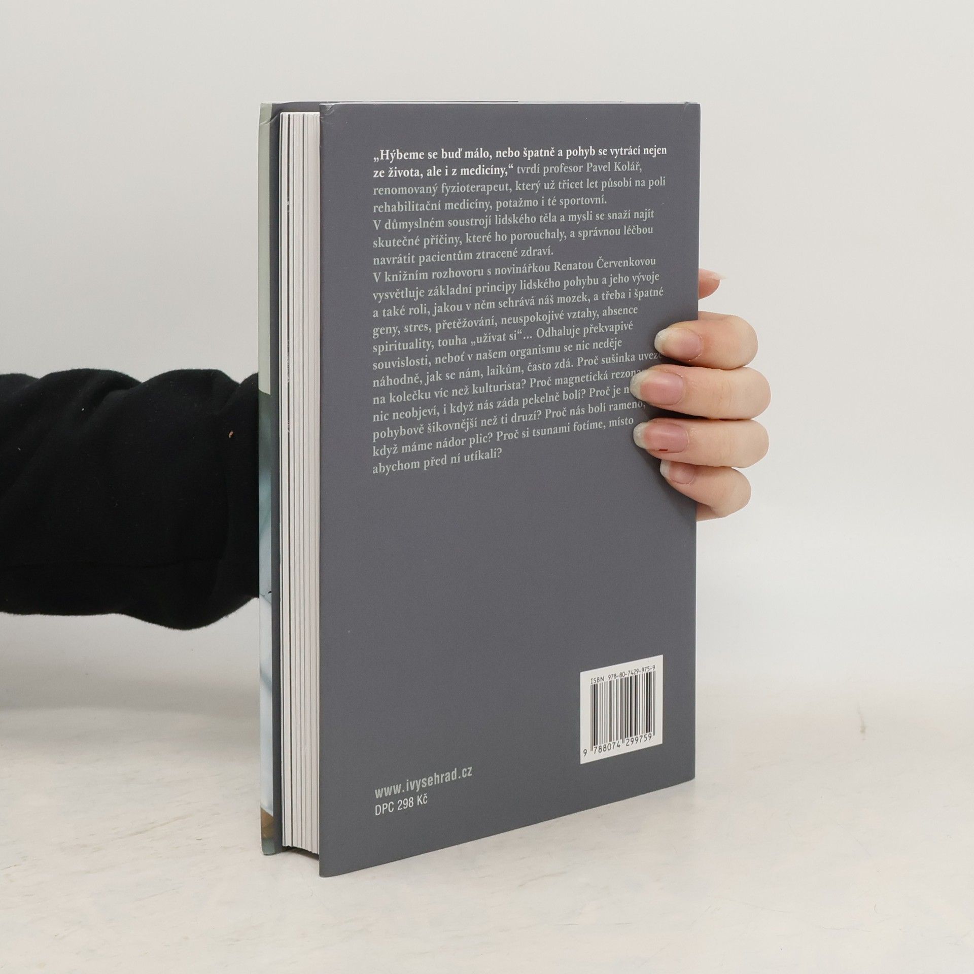 Knižní rozhovor s renomovaným fyzioterapeutem prof. Kolářem. „Hýbeme se buď málo, nebo špatně a pohyb se vytrácí nejen ze života, ale i z medicíny,“ tvrdí profesor Pavel Kolář, renomovaný fyzioterapeut, který už třicet let působí na poli rehabilitační medicíny, potažmo i té sportovní. V důmyslném soustrojí lidského těla a mysli se snaží najít skutečné příčiny, které ho porouchaly, a správnou léčbou navrátit pacientům ztracené zdraví. V rozhovorech s novinářkou Renátou Červenkovou vysvětluje základní principy lidského pohybu a jeho vývoje a také roli, jakou v něm sehrává náš mozek a třeba i špatné geny, stres, přetěžování, neuspokojivé vztahy, absence spirituality, touha „užívat si“... Odhaluje překvapivé souvislosti, neboť v našem organismu se nic neděje náhodně, jak se nám, laikům, často zdá. Proč nás bolí rameno, když máme nádor plic? Proč sušinka uveze na kolečku víc než kulturista? Proč magnetická rezonance nic neobjeví, i když nás záda pekelně bolí? Proč je někdo pohybově šikovnější než ti druzí? Proč si tsunami fotíme, místo abychom před ní utíkali?