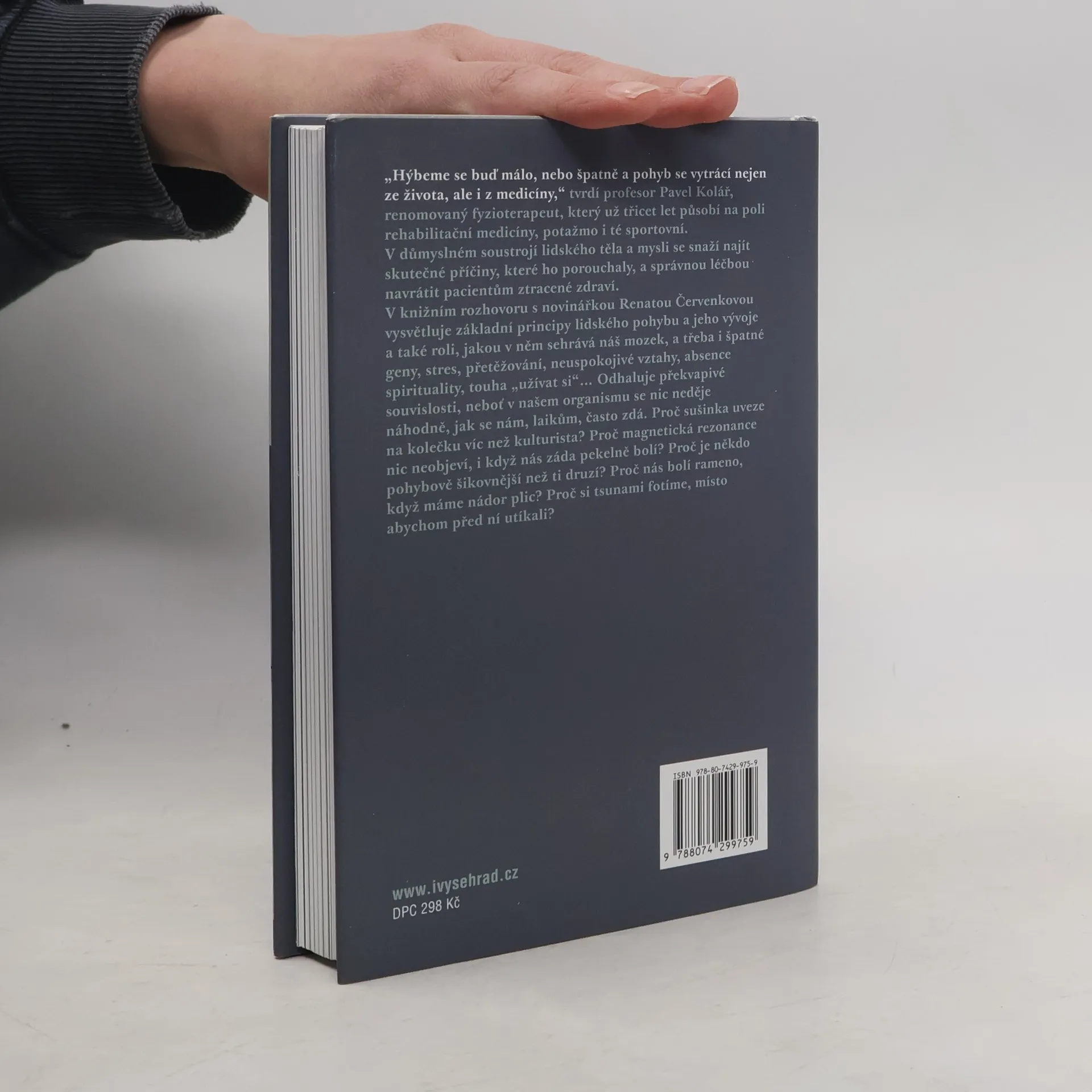 Knižní rozhovor s renomovaným fyzioterapeutem prof. Kolářem. „Hýbeme se buď málo, nebo špatně a pohyb se vytrácí nejen ze života, ale i z medicíny,“ tvrdí profesor Pavel Kolář, renomovaný fyzioterapeut, který už třicet let působí na poli rehabilitační medicíny, potažmo i té sportovní. V důmyslném soustrojí lidského těla a mysli se snaží najít skutečné příčiny, které ho porouchaly, a správnou léčbou navrátit pacientům ztracené zdraví. V rozhovorech s novinářkou Renátou Červenkovou vysvětluje základní principy lidského pohybu a jeho vývoje a také roli, jakou v něm sehrává náš mozek a třeba i špatné geny, stres, přetěžování, neuspokojivé vztahy, absence spirituality, touha „užívat si“... Odhaluje překvapivé souvislosti, neboť v našem organismu se nic neděje náhodně, jak se nám, laikům, často zdá. Proč nás bolí rameno, když máme nádor plic? Proč sušinka uveze na kolečku víc než kulturista? Proč magnetická rezonance nic neobjeví, i když nás záda pekelně bolí? Proč je někdo pohybově šikovnější než ti druzí? Proč si tsunami fotíme, místo abychom před ní utíkali?