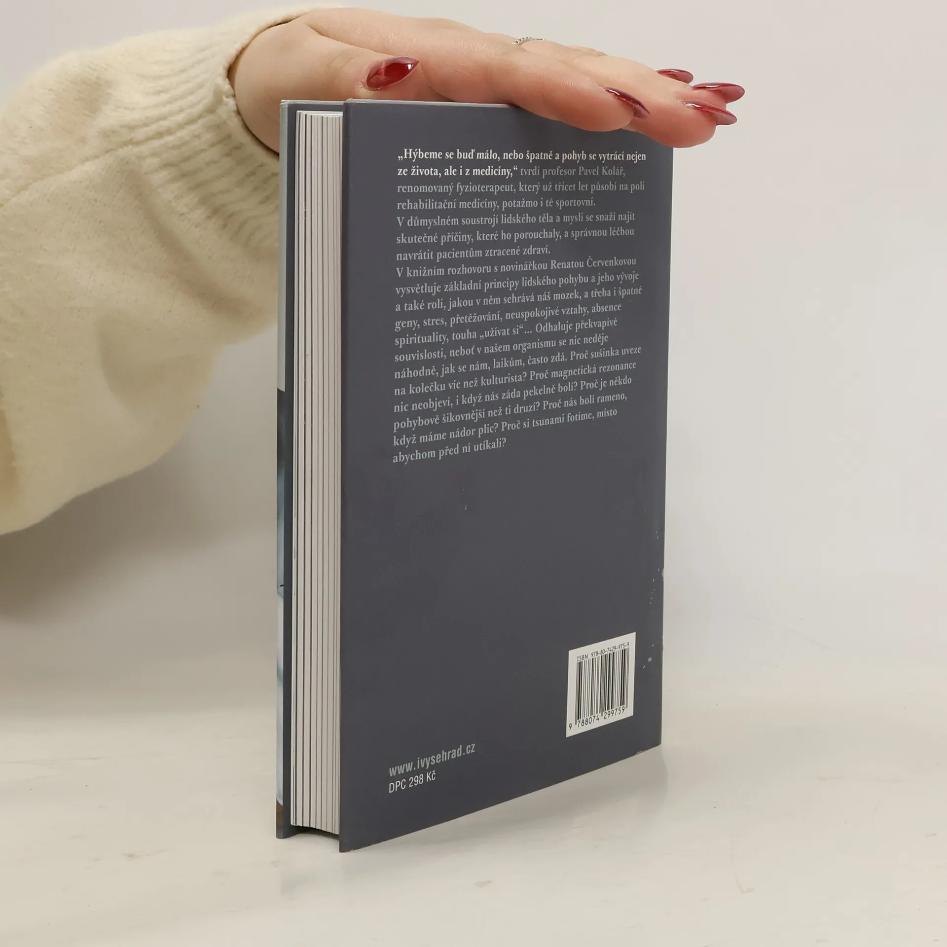 Knižní rozhovor s renomovaným fyzioterapeutem prof. Kolářem. „Hýbeme se buď málo, nebo špatně a pohyb se vytrácí nejen ze života, ale i z medicíny,“ tvrdí profesor Pavel Kolář, renomovaný fyzioterapeut, který už třicet let působí na poli rehabilitační medicíny, potažmo i té sportovní. V důmyslném soustrojí lidského těla a mysli se snaží najít skutečné příčiny, které ho porouchaly, a správnou léčbou navrátit pacientům ztracené zdraví. V rozhovorech s novinářkou Renátou Červenkovou vysvětluje základní principy lidského pohybu a jeho vývoje a také roli, jakou v něm sehrává náš mozek a třeba i špatné geny, stres, přetěžování, neuspokojivé vztahy, absence spirituality, touha „užívat si“... Odhaluje překvapivé souvislosti, neboť v našem organismu se nic neděje náhodně, jak se nám, laikům, často zdá. Proč nás bolí rameno, když máme nádor plic? Proč sušinka uveze na kolečku víc než kulturista? Proč magnetická rezonance nic neobjeví, i když nás záda pekelně bolí? Proč je někdo pohybově šikovnější než ti druzí? Proč si tsunami fotíme, místo abychom před ní utíkali?