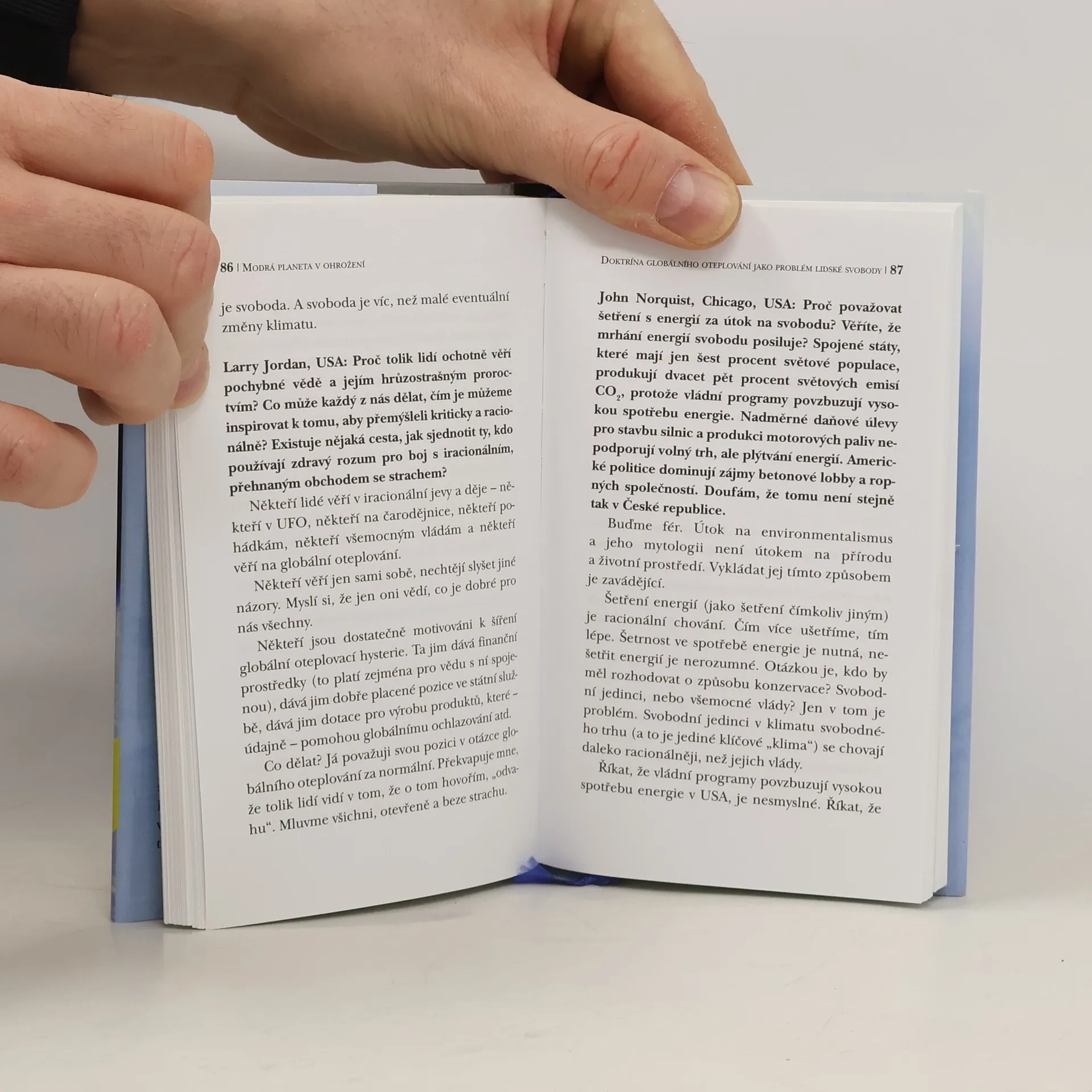 Kniha Modrá planeta v ohrožení není souvislým textem, ale jednotu jí dodává to, že vychází z jednoho konzistentního názoru, z jednoho uceleného pohledu na svět, z důsledné aplikace standardní, tedy mainstreamové ekonomie, z jednoho společensko-vědního paradigmatu, který je důsledně liberální (v evropském slova smyslu) a který zejména nesouhlasí s tím, aby byla sporná myšlenka globálního oteplování a ještě daleko spornější myšlenka dominantního vlivu člověka na globální klima a na globální teplotu zneužívána k dalšímu radikálnímu vstupu státu a politiky do lidské společnosti, čehož jsme právě teď svědky.