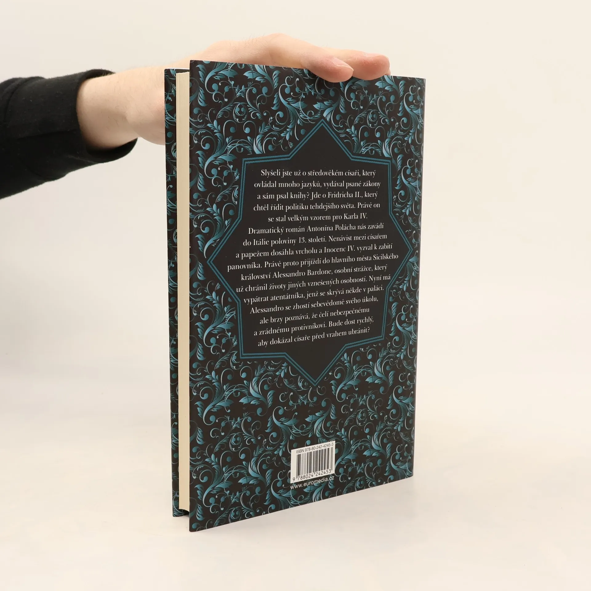 Slyšeli jste už o středověkém císaři, který ovládal mnoho jazyků, vydával psané zákony a sám psal knihy? Jde o Fridricha II., který chtěl řídit politiku tehdejšího světa. Právě on se stal velkým vzorem Karla IV. Dramatický román Antonína Polácha nás zavádí do Itálie poloviny 13. století. Nenávist mezi císařem a papežem dosáhla vrcholu a Inocenc IV. vyzval k vraždě panovníka. Právě proto přijíždí do hlavního města Sicilského království Alessandro Bardone, osobní strážce, který už chránil životy jiných vznešených osobností. Nyní má vypátrat atentátníka, jenž se skrývá někde v paláci. Alessandro se zhostí sebevědomě svého úkolu, ale brzy poznává, že čelí nebezpečnému a zrádnému protivníkovi. Bude dost rychlý, aby dokázal císaře před vrahem ubránit?