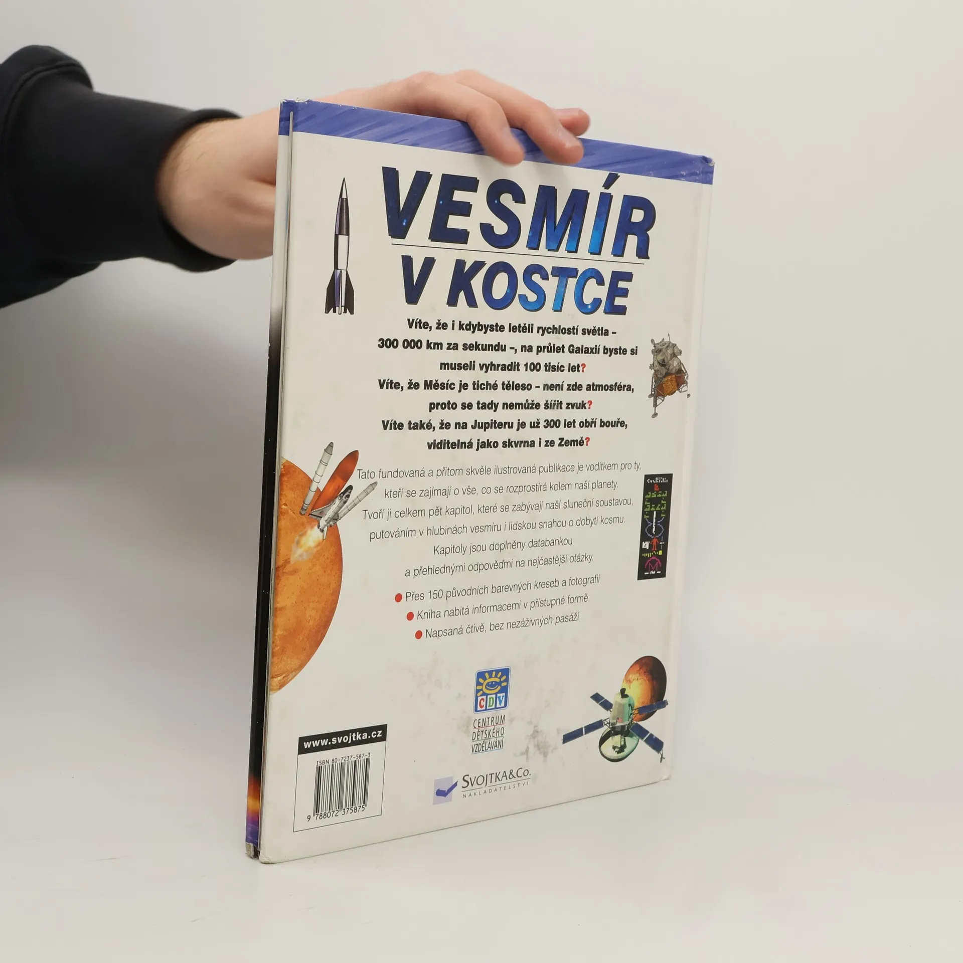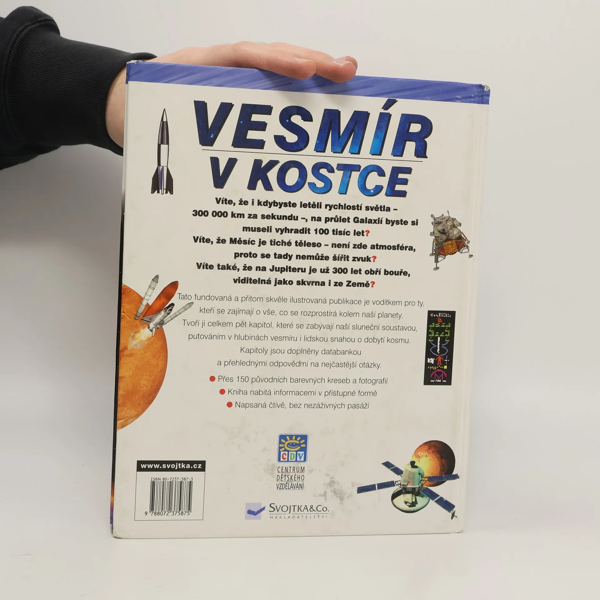 Fundovaná a skvěle ilustrovaná publikace pro děti a mládež zajímající se o vše, co se rozprostírá kolem naší planety. Tvoří ji celkem šest kapitol, které se zabývají naší sluneční soustavou, putováním hlubinami vesmíru, i lidskou snahou o dobytí kosmu, doplněnou slovníčkem a rejstříkem.