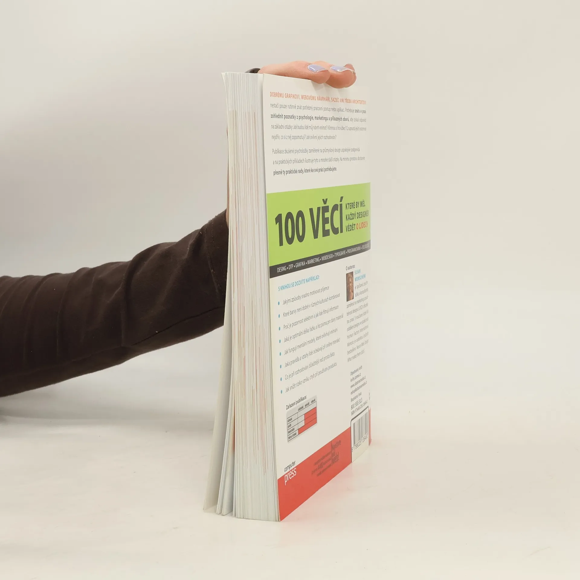 DOBRÉMU GRAFIKOVI, WEBOVÉMU NÁVRHÁŘI, SAZEČI ANI TŘEBA ARCHITEKTOVI nestačí pouze rutinně znát potřebný pracovní postup nebo aplikaci. Potřebuje znát a v praxi zohlednit poznatky z psychologie, marketingu a příbuzných oborů, aby získal odpovědi na základní otázky: Jak budou lidé můj návrh vnímat? Všimnou si ho vůbec? Co upoutá jejich pozornost nejdřív, co si z něj zapamatují? Jak ovlivní jejich rozhodování? Publikace zkušené psycholožky zaměřené na průmyslový design uspokojivě zodpovídá a na praktických příkladech ilustruje tyto a mnohé další otázky. Na minimu prostoru dostanete přesně ty praktické rady, které ke své práci potřebujete. S KNIHOU SE DOZVÍTE NAPŘÍKLAD: * Jakými způsoby snadno motivovat příjemce * Které barvy není dobré v různých kulturách kombinovat * Proč je pozornost selektivní a jak lidé filtrují informace * Jaká je optimální délka řádku a řez písma pro daný materiál * Jak fungují mentální modely, které ovlivňují vnímání * Jaká pravidla a vztahy lidé očekávají při online interakci * Co je při rozhodování důležitější než prostá fakta * Jak snížit riziko vzniku chyb při používání produktu