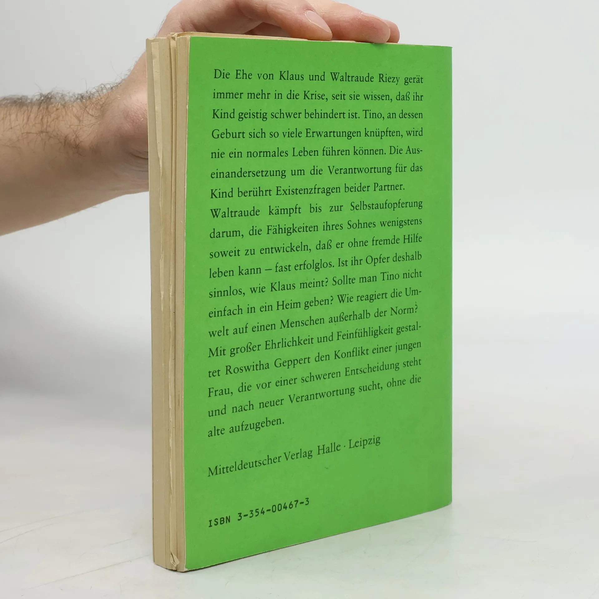 Die Ehe von Klaus und Waltraude Riezy gerät immer mehr in die Krise, seit sie wissen, dass ihr Kind geistig schwer behindert ist. Tino, an dessen Geburt sich so viele Erwartungen knüpften, wird nie ein normales Leben führen können. Die Auseinandersetzung um die Verantwortung für das Kind berührt Existenzfragen beider Partner. Waltraude kämpft bis zur Selbstaufopferung darum, die Fähigkeiten ihres Sohnes wenigstens so weit zu entwickeln, dass er ohne fremde Hilfe leben kann - fast erfolglos. Ist ihr Opfer deshalb sinnlos, wie Klaus meint? Sollte man Tino nicht einfach in ein Heim geben? Wie reagiert die Umwelt auf einen Menschen außerhalb der Norm?Mit großer Ehrlichkeit und Feinfühligkeit gestaltet Roswitha Geppert den Konflikt einer jungen Frau, die vor einer schweren Entscheidung steht und nach neuer Verantwortung sucht, ohne die alte aufzugeben.