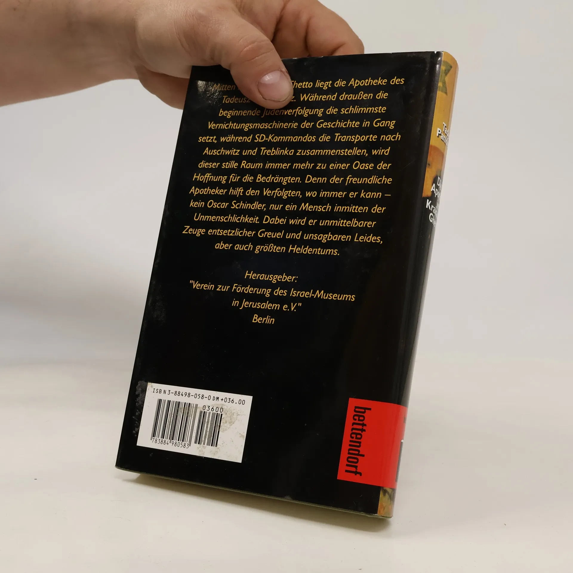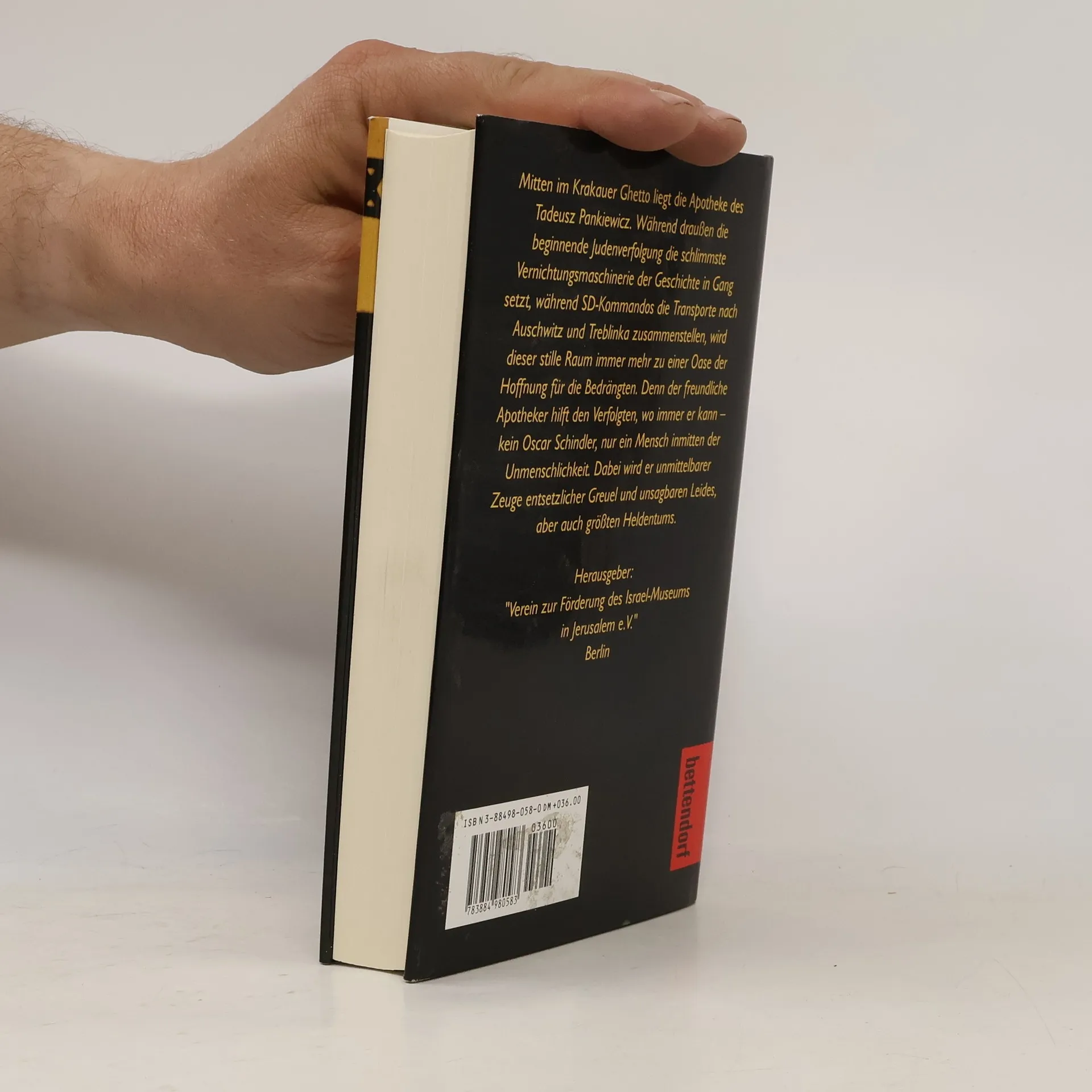 Klappentext: Mitten im Krakauer Ghetto liegt die Apotheke des Tadeusz Pankiewicz. Während draußen die beginnende Judenverfolgung die schlimmste Vernichtungsmaschinerie der Geschichte in Gang setzt, während SD-Kommandos die Transporte nach Auschwitz und Treblinka zusammenstellen, wird dieser stille Raum immer mehr zu einer Oase der Hoffnung für die Bedrängten. Denn der freundliche Apotheker hilft den Verfolgten, wo immer er kann - kein Oskar Schindler, nur ein Mensch inmitten der Unmenschlichkeit. Dabei wird er unmittelbar Zeuge entsetzlicher Gräuel und unsagbaren Leides, aber auch größten Heldentums.