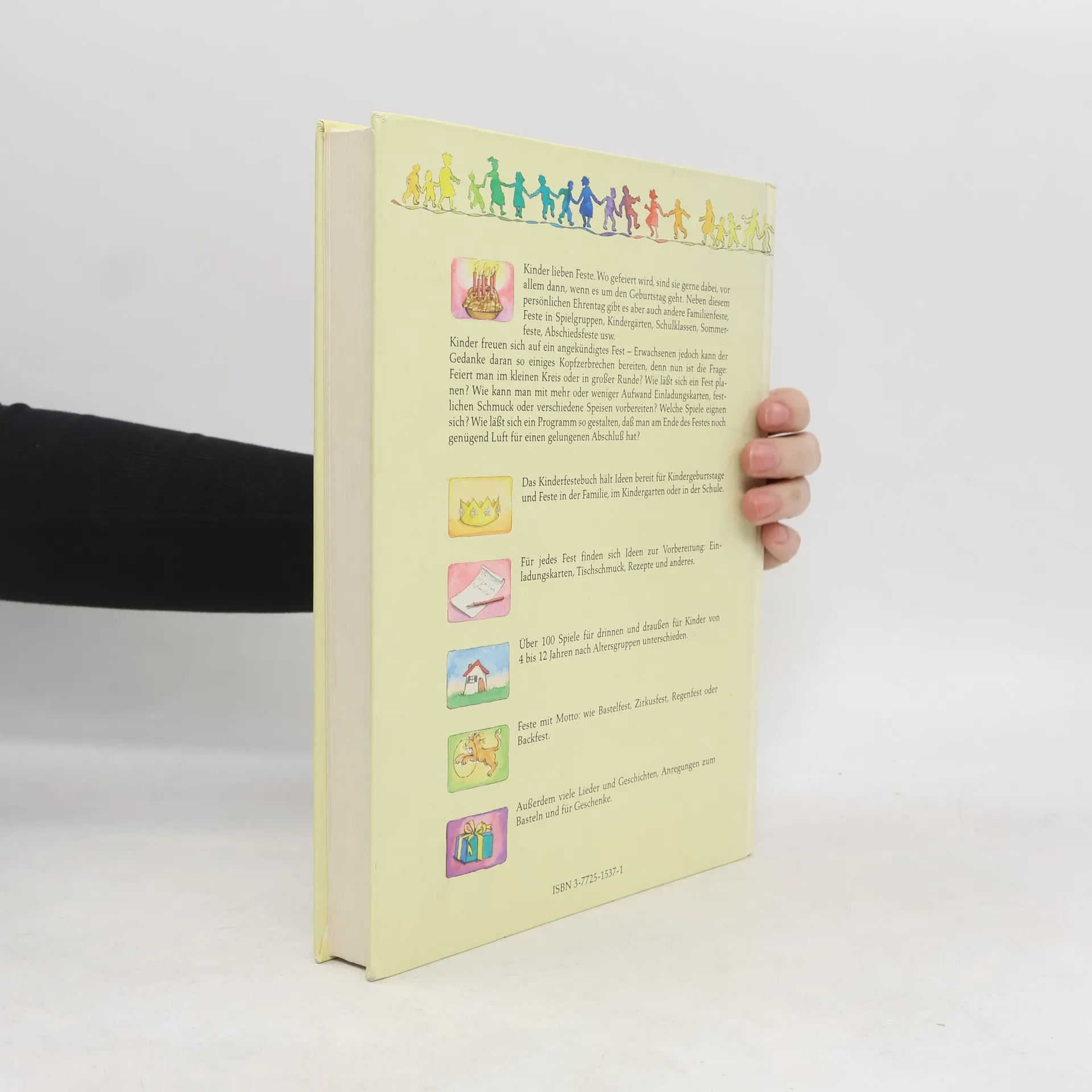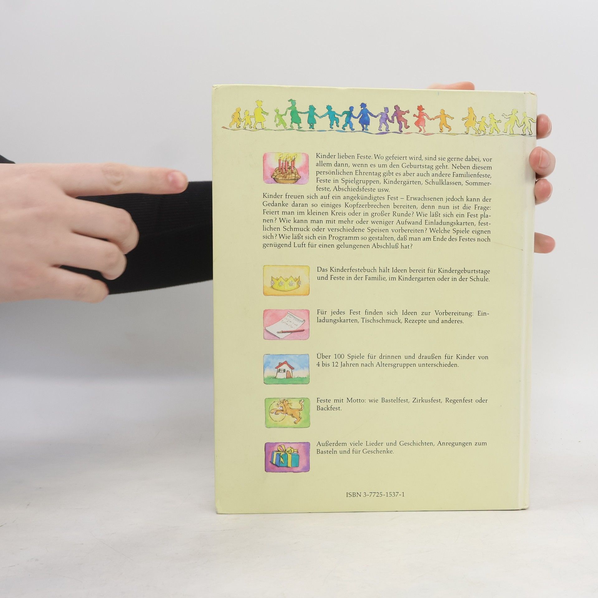 Das Kinderfestebuch hält Ideen bereit für Kindergeburtstage und Feste in der Familie, im Kindergarten oder in der Schule. Für jedes Fest finden sich Ideen zur Vorbereitung: Einladungskarten, Tischschmuck, Rezepte und anderes. Über 100 Spiele für drinnen und draußen für Kinder von 4-12 Jahren nach Altersgruppen unterschieden. Feste mit Motto: wie Bastelfest, Zirkusfest, Regenfest oder Backfest. Außerdem viele Lieder und Geschichten, Anregungen zum Basteln und für Geschenke.