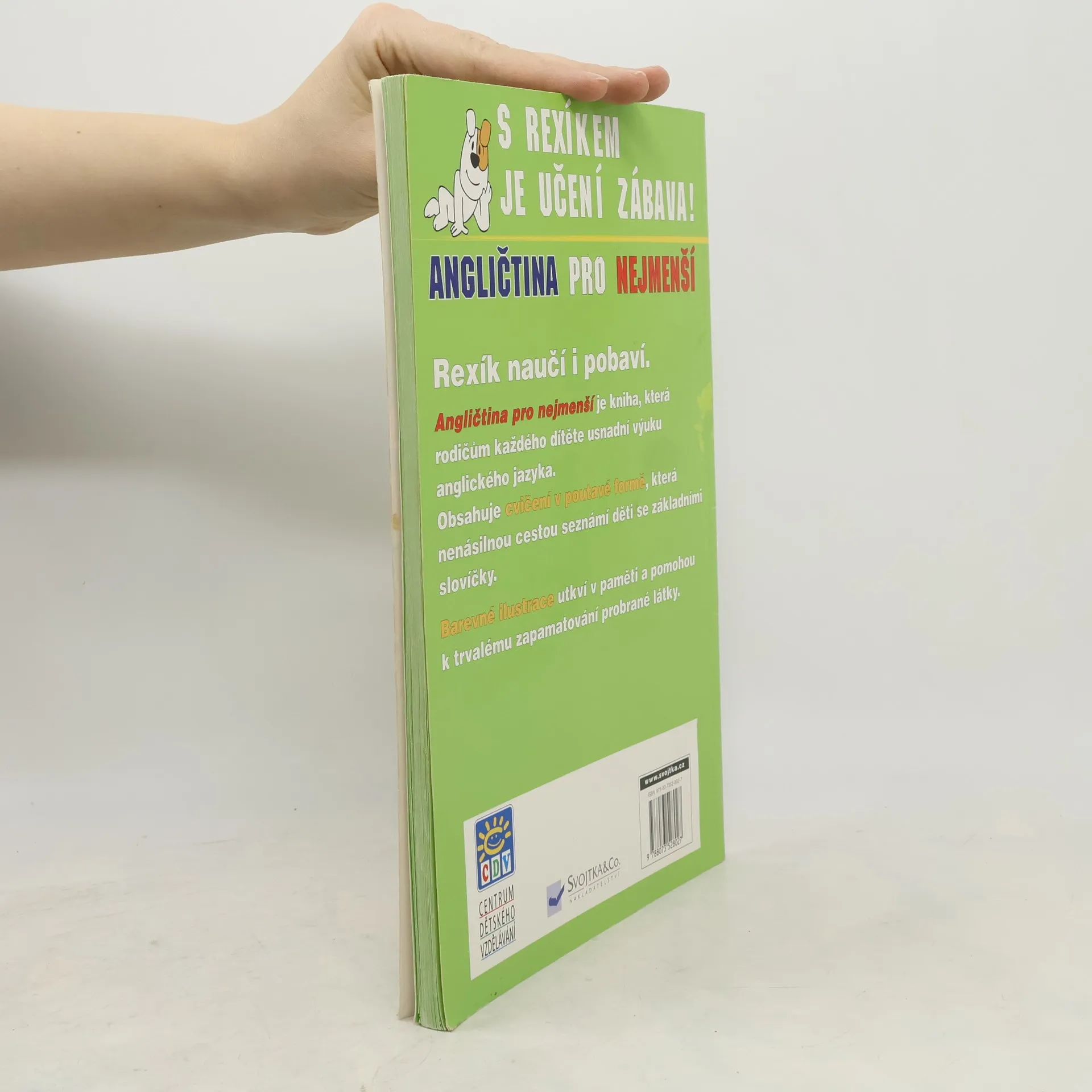 Rexík se moc rád učí anglicky a rád vám bude v učení průvodcem. Při prohlížení této knížky se děti dozvědí, jak se jmenují různé předměty i zvířata v angličtině. Naučí se také mnoho slovíček. Každé z nich je znázorněno barevným obrázkem, který usnadňuje jejich zapamatování. A co navíc? Kniha obsahuje mnoho různých hádanek, díky kterým si lépe zapamatuje nová slovíčka. Učit se anglicky s Rexíkem je prostě zábava!