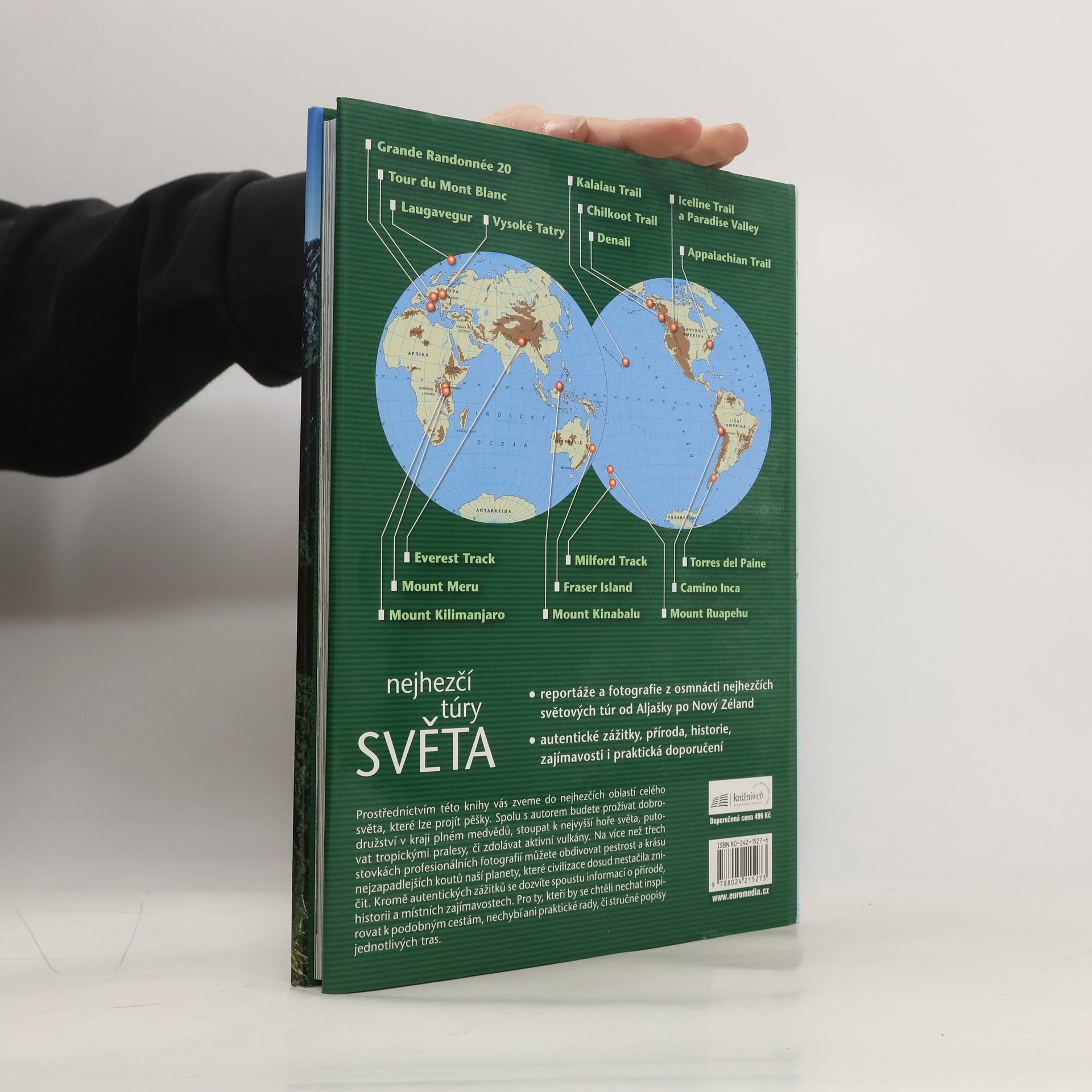 Reportáže, fotografie, autentické zážitky, příroda, historie, zajímavosti. Obsah: EVROPA 1. Laugavegur Islandskými duhovými horami (Island) 2. Tour du Mont Blanc Okolo nejvyšší hory Evropy (Francie, Itálie, Švýcarsko) 3. Grande Randonée 20 Přechod nejhornatějšího ostrova středomoří (Korsika) 4. Tatranská Magistrála V nejmenších velehorách světa (Slovensko) ASIE 5. Everest Track K nejvyšší hoře světa (Nepál) 6. Mount Kinabalu Na střeše Bornea (Malajsie) AFRIKA 7. Mount Kilimanjaro Výstup na nejvyšší horu Afriky (Tanzanie) 8. Mount Meru Trekking mezi žirafami a slony (Tanzanie) AUSTRÁLIE a OCEÁNIE 9. Na Pali Coast Pod nejvyššími útesy Havaje (Havajské ostrovy - USA) 10. Fraser Island Krajem největších louží a psů dingo (Austrálie) 11. Milford Track Horami Jižních Alp (Nový Zéland) 12. Okolo Mt. Ruapehu Po aktivních vulkánech Severního ostrova (Nový Zéland) SEVERNÍ AMERIKA 13. Chilkoot Trail Nejslavnější stezkou zlaté horečky (Aljaška a Kanada) 14. Národní park Denali Serengeti severu (Aljaška) 15. Iceline Trail a Paradise Valley Dva klenoty Skalistých hor (Kanada) 16. Appalachian Trail Hřebenem amerických prezidentů (USA) JIŽNÍ AMERIKA 17. Inka Trail Po incké cestě Do Macchu Pichu (Peru) 18. Torres de Paine Okolo patagonských skalních věží (Chile)