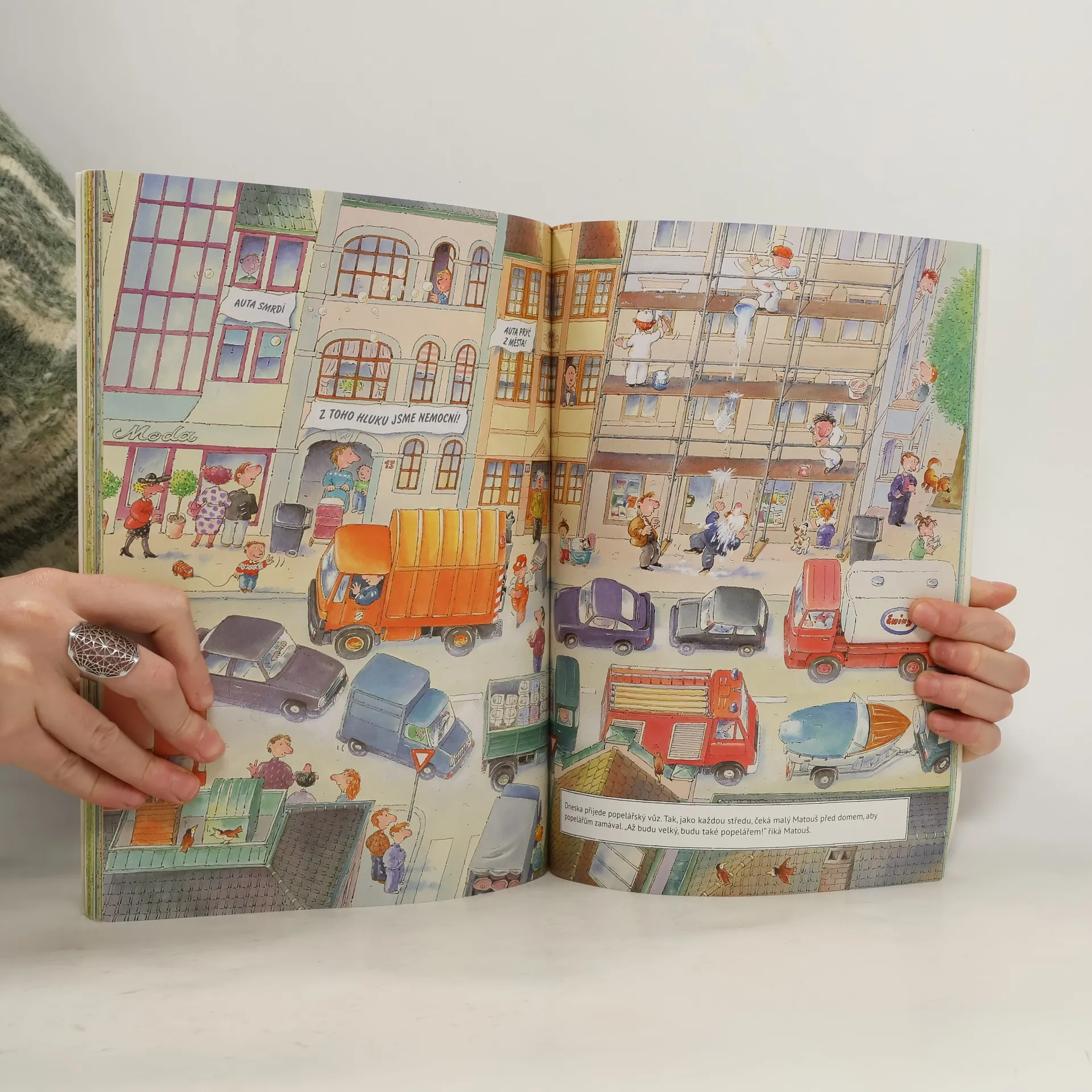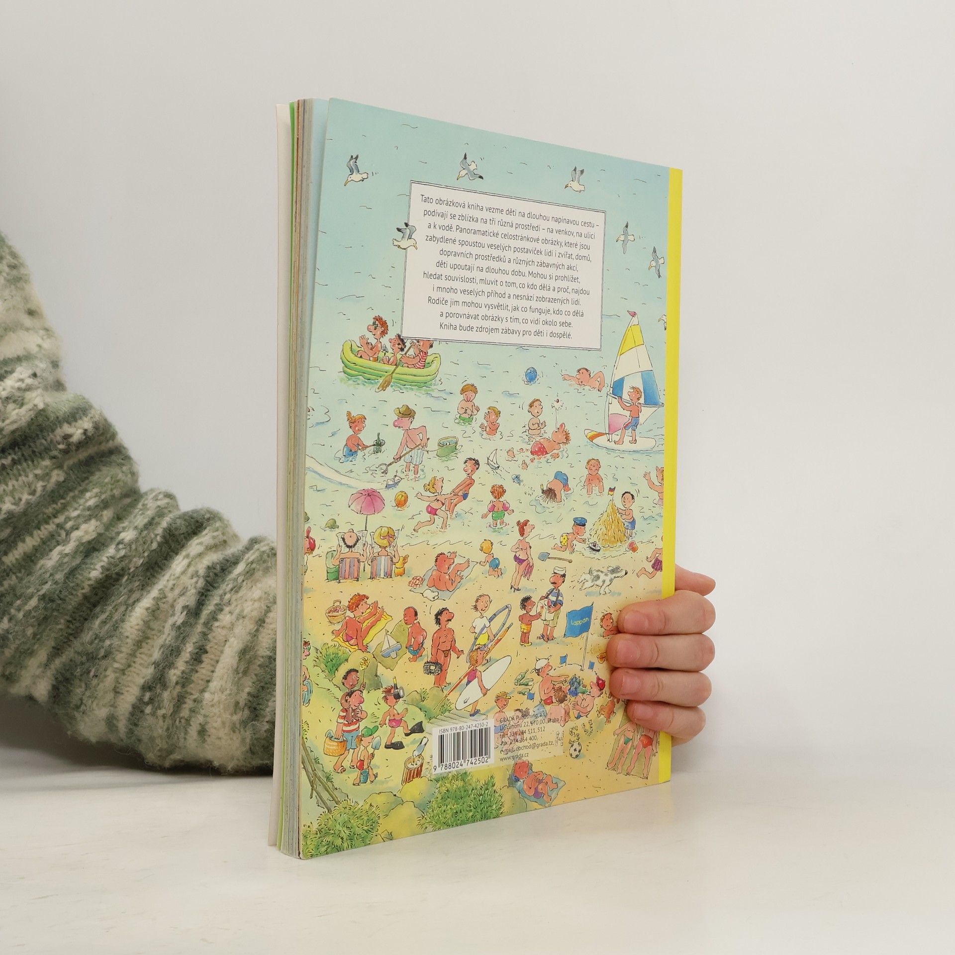 Velká obrázková kniha vezme děti na dlouhou napínavou cestu - podívají se zblízka na tři různá prostředí - na venkov, na ulici a k vodě. Panoramatické celostránkové obrázky, které jsou zabydlené spoustou veselých postaviček lidí i zvířat, domů, dopravních prostředků, zábavných akcí děti upoutají na dlouhou dobu.