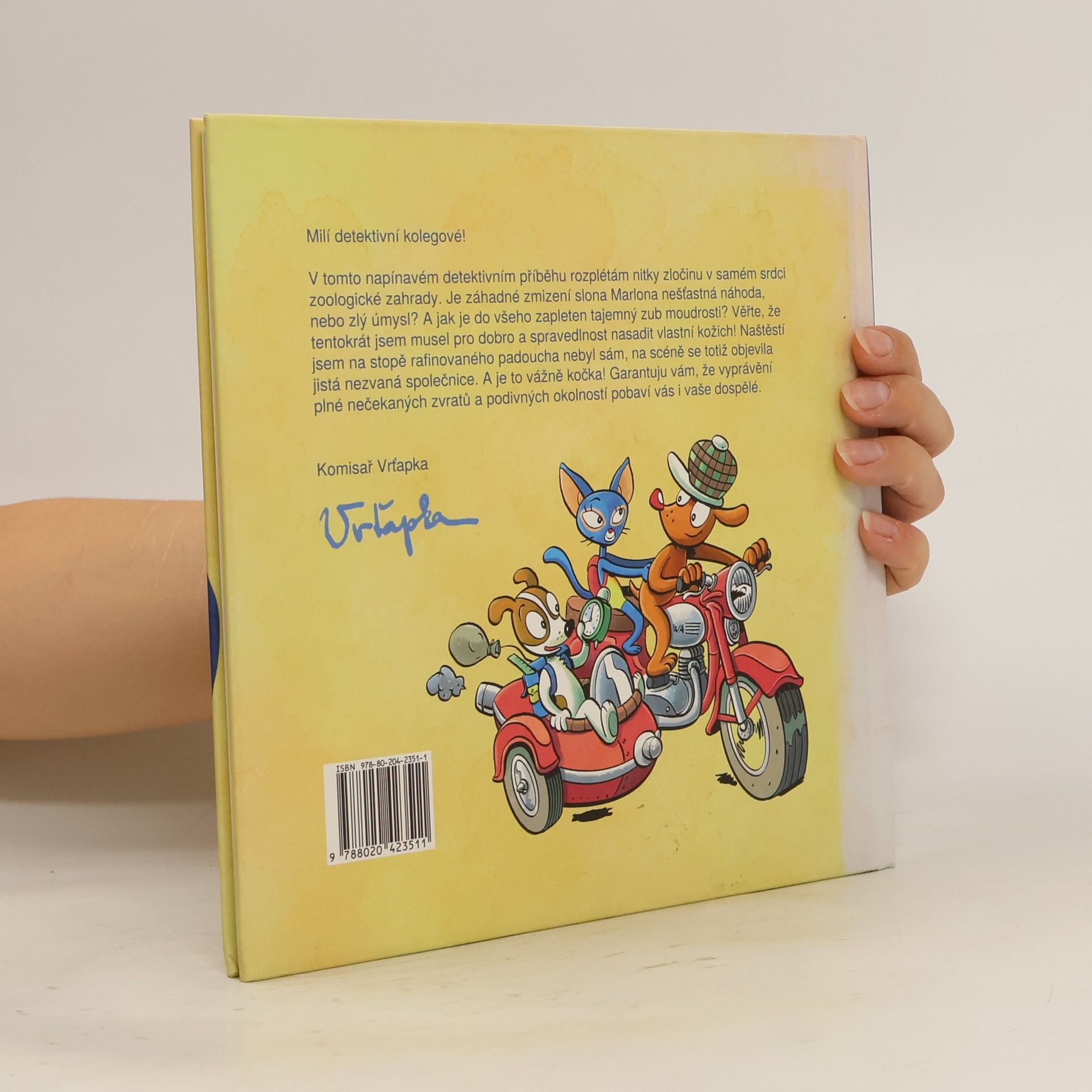 Slavný hrdina tentokrát přichází s něčím opravdu nevídaným! První dobrodružný příběh komisaře Vrťapky v podobě dětské detektivky s komiksovými ilustracemi. V napínavém příběhu Vrťapka rozplétá nitky zločinu v samém srdci zoologické zahrady. Je záhadné zmizení slona Marlona nešťastná náhoda, nebo zlý úmysl? A jak je do všeho zapleten tajemný zub moudrosti? Mějte na paměti, že komisař Vrťapka tentokrát pro dobro a spravedlnost nasazuje vlastní kožich. Naštěstí není věhlasný detektiv na stopě rafinovaného padoucha sám, v patách má nezvanou společnici. A je to vážně kočka! Příběh plný nečekaných zvratů a podivných okolností pobaví malé i velké čtenáře. Tak vzhůru za případy, ať nám nevychladne stopa!