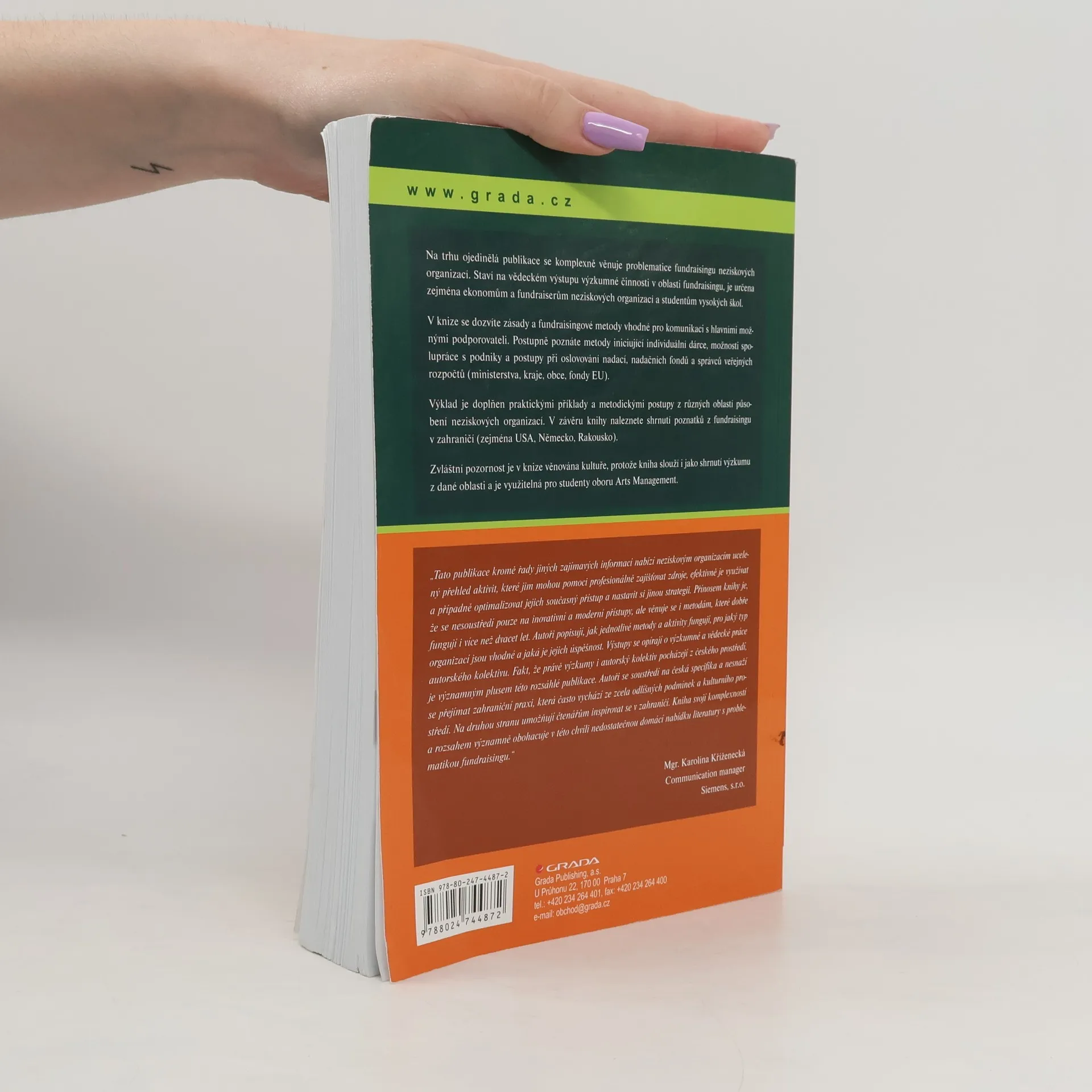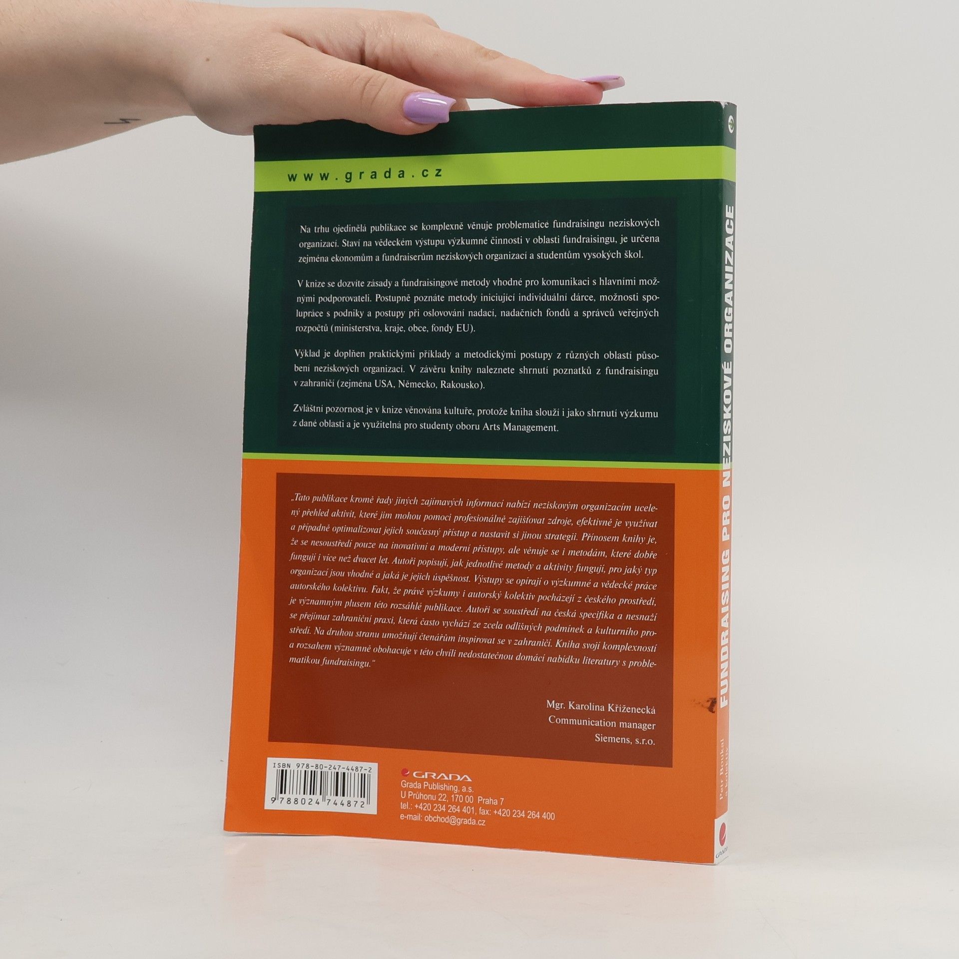 Na trhu ojedinělá publikace se komplexně věnuje problematice fundraisingu neziskových organizací. Staví na vědeckém výstupu výzkumné činnosti v oblasti fundraisingu, je určena zejména ekonomům a fundraiserům neziskových organizací a studentům vysokých škol. V knize se dozvíte zásady a fundraisingové metody vhodné pro komunikaci s hlavními možnými podporovateli. Postupně poznáte metody iniciující individuální dárce, možnosti spolupráce s podniky a postupy při oslovování nadací, nadačních fondů a správců veřejných rozpočtů (ministerstva, kraje, obce, fondy EU). Výklad je doplněn praktickými příklady a metodickými postupy z různých oblastí působení neziskových organizací. V závěru knihy naleznete shrnutí poznatků z fundraisingu v zahraničí (zejména USA, Německo, Rakousko). Zvláštní pozornost je v knize věnována kultuře, protože kniha slouží i jako shrnutí výzkumu z dané oblasti a je využitelná pro studenty oboru Arts Management.