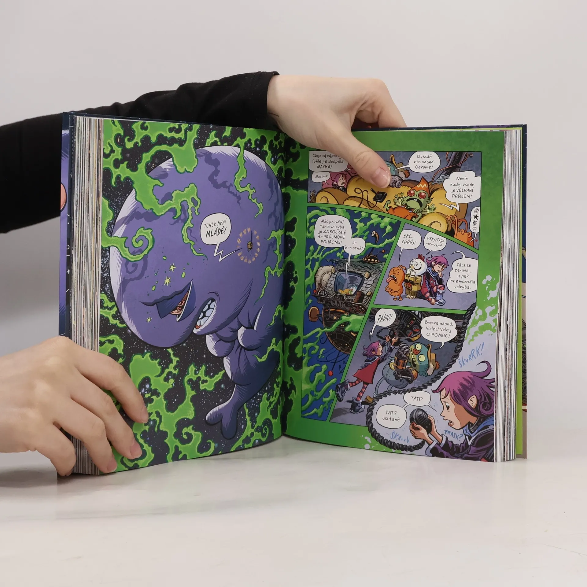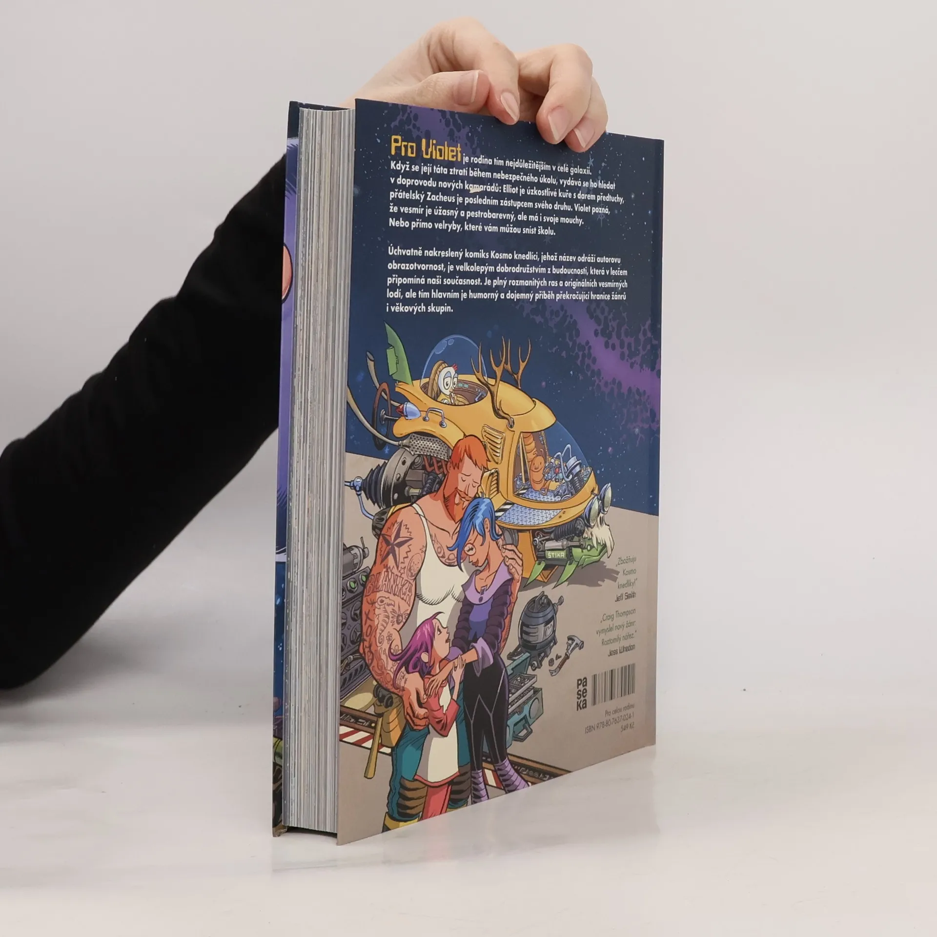 Pro Violet je rodina tou nejdůležitější věcí v celé galaxii. Když se její táta ztratí během nebezpečného úkolu, vydává se ho hledat v doprovodu nových kamarádů: Jeden je kuře s věšteckými schopnostmi, druhý je posledním mimozemšťanem svého druhu. Violet pozná, že vesmír je úžasný a pestrobarevný, ale má i svoje mouchy. Nebo přímo velryby, které vám můžou sníst školu. Úchvatně nakreslený komiks Kosmo knedlíci je velkolepým dobrodružstvím z budoucnosti, která nápadně připomíná naši současnost. Je plný rozmanitých ras a originálních vesmírných lodí, ale tím hlavním je humorný i dojemný příběh překračující hranice žánrů i věkových skupin.